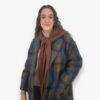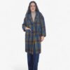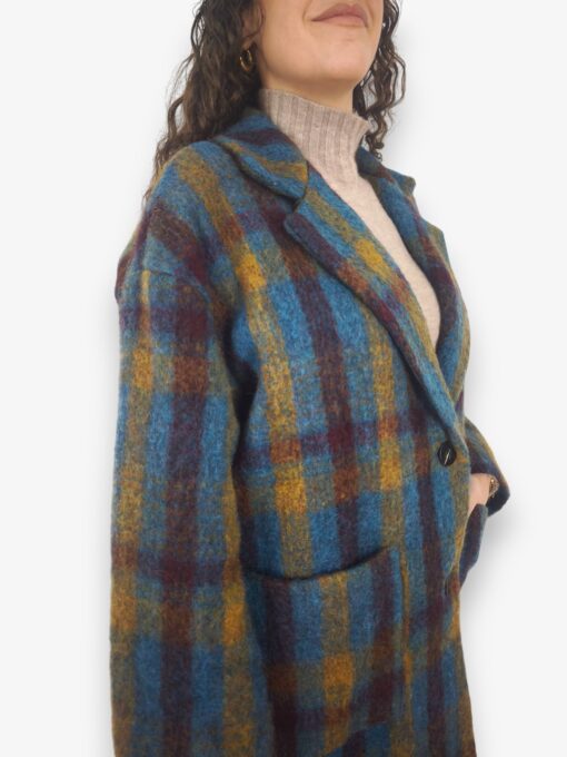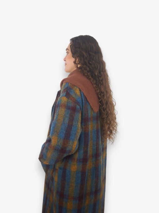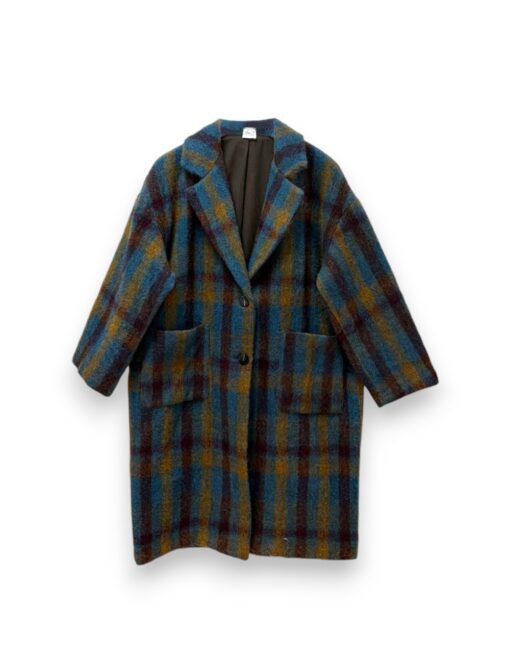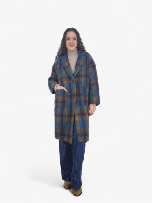 Abrigo 3/4 en tejido de lana con estampado de cuadros. Corte oversize y cuello de solapa. Bolsillos de plastón y cierre de botón. Forro interior.