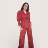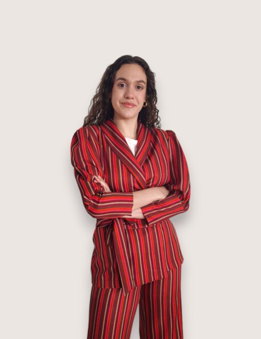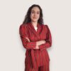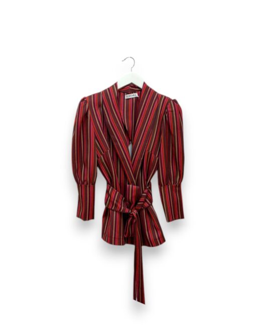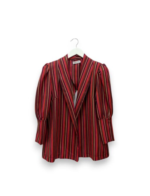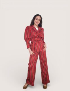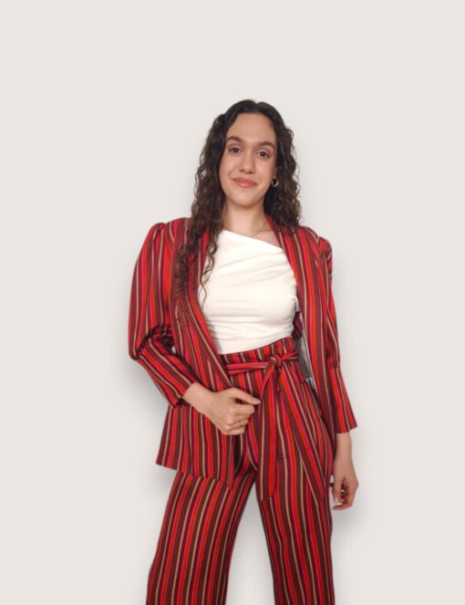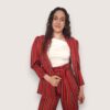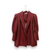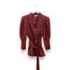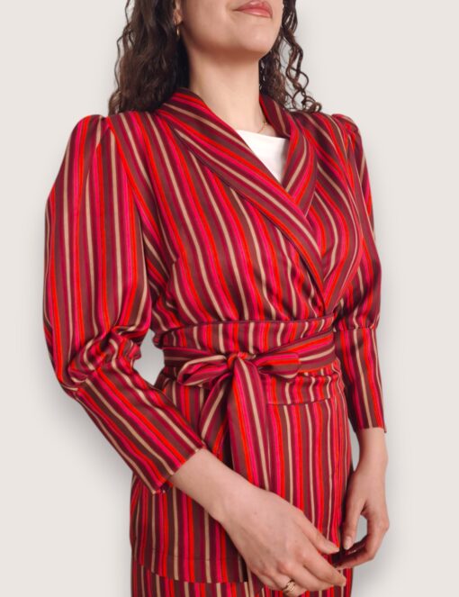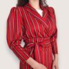 Blazer de rayas en color rojo. Cuello de solapa y cierre con cinturón del mismo tejido. Mangas abullonadas con puño ancho.