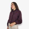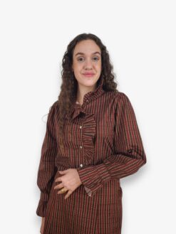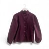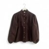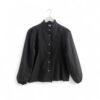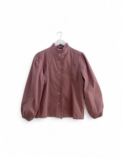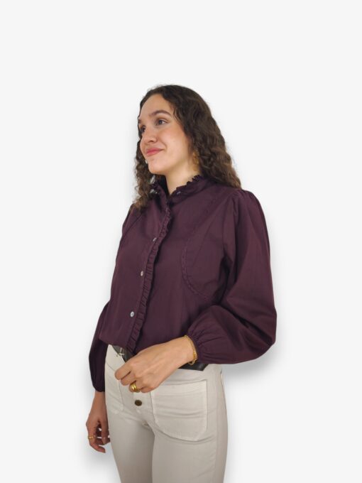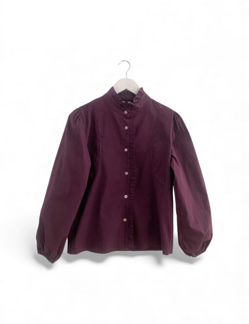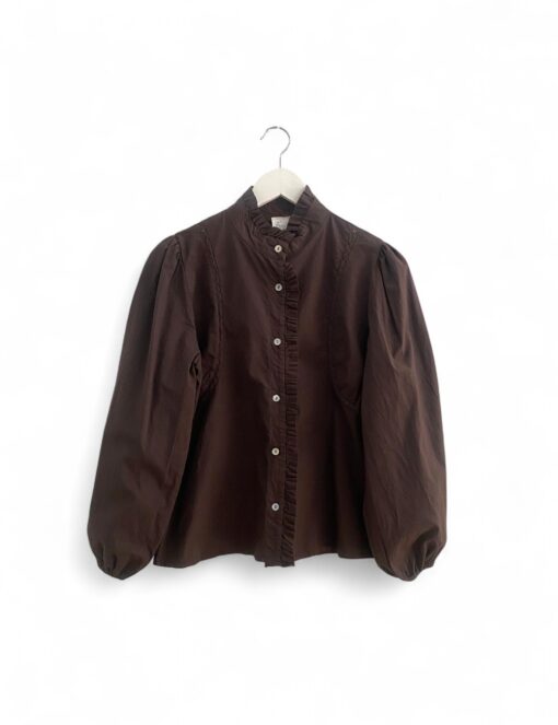 Blusa lisa de algodón con botones. Cuello y pecho con detalle de volante. Manga abullonada con elástico en el puño.