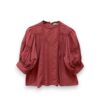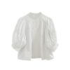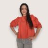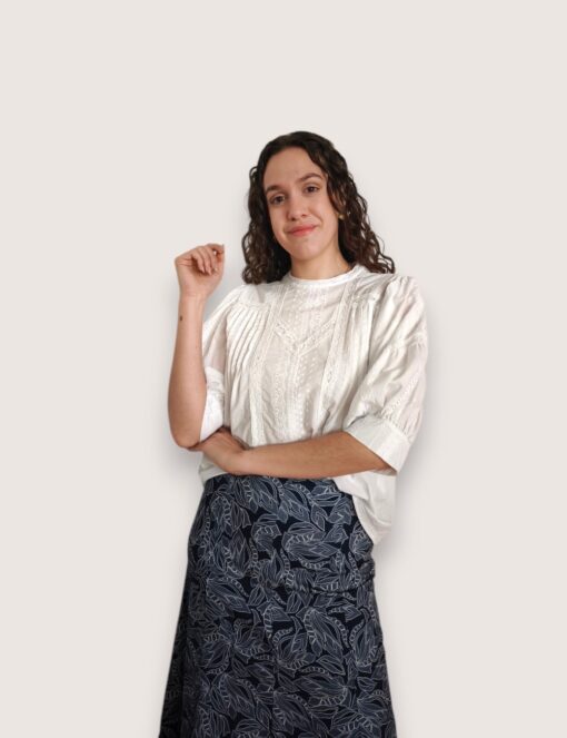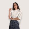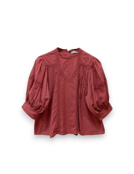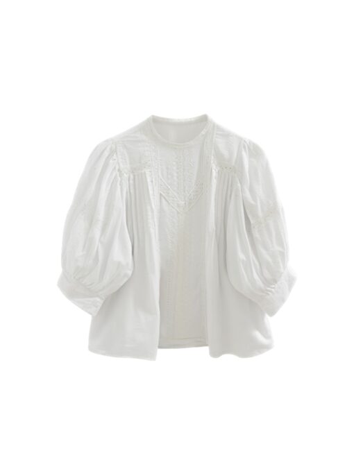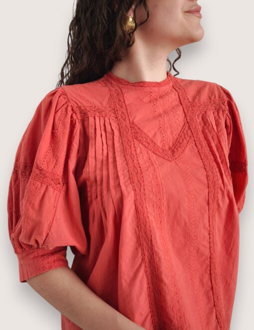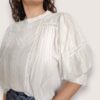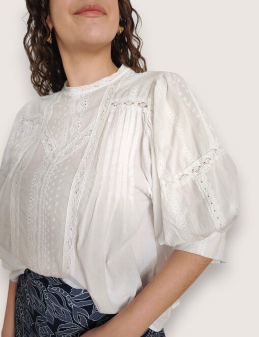 Blusa de batista de estilo romántico con cuello redondo. Detalle de encaje y tiras de puntilla calada. Manga abullonada al codo.