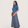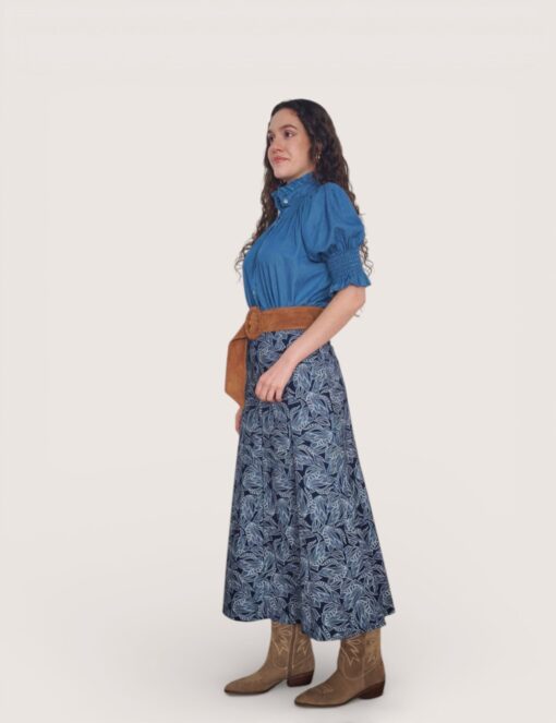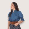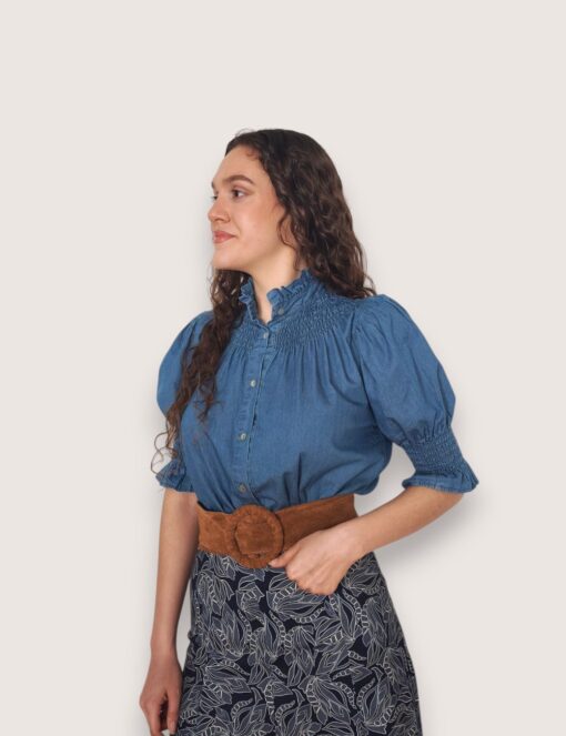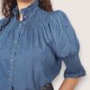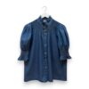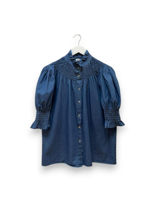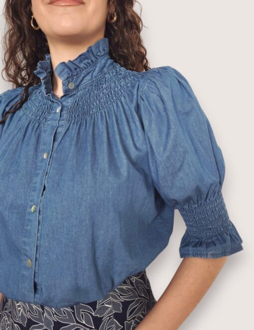 Blusa de algodón en tejido denim ligero. Maxi cuello elástico y botonadura delantera. Manga corta abullonada con elástico en el puño.