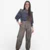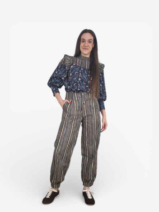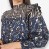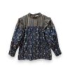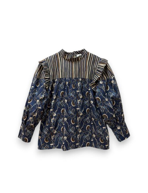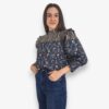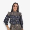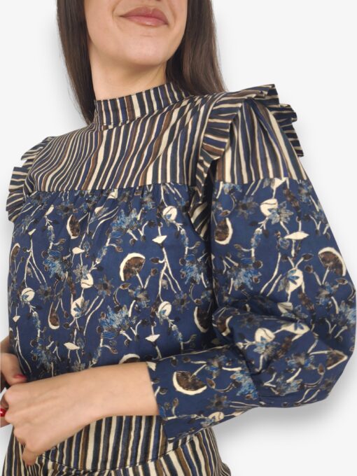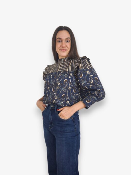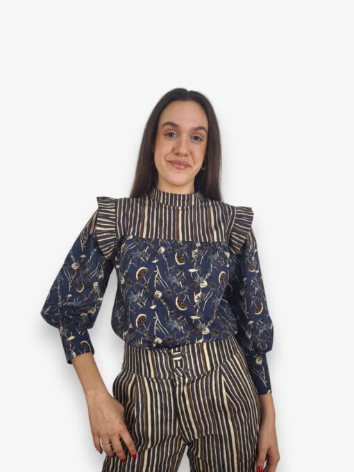 Blusa estampada de algodón con corte de canesú y cuello de tira. Volante en la hombrera y manga francesa con puño ancho.