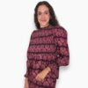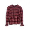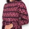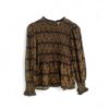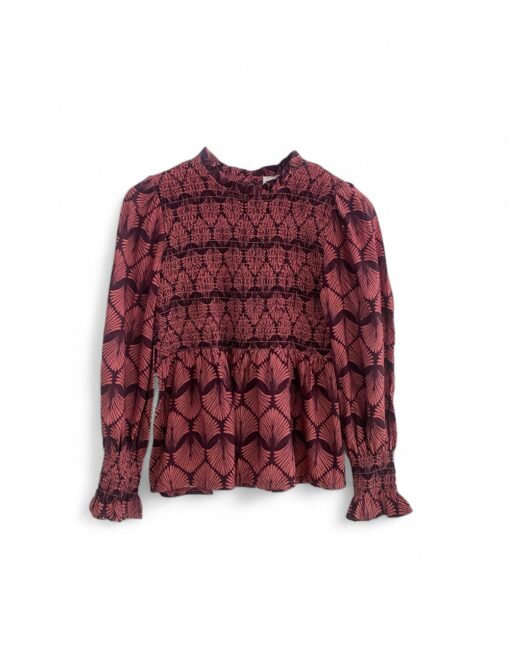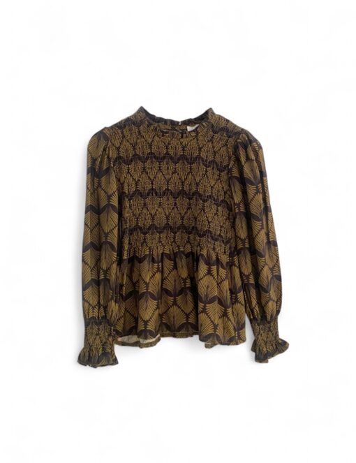 Blusa estampada con pecho elástico en nido de abeja y volante inferior. Manga abullonada con puño elástico. Cierre trasero al cuello.