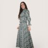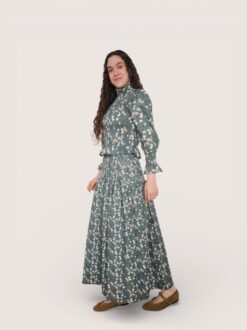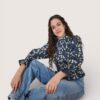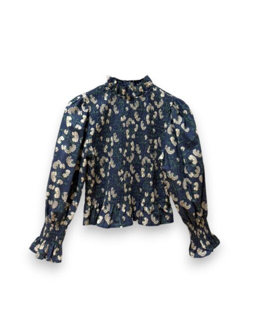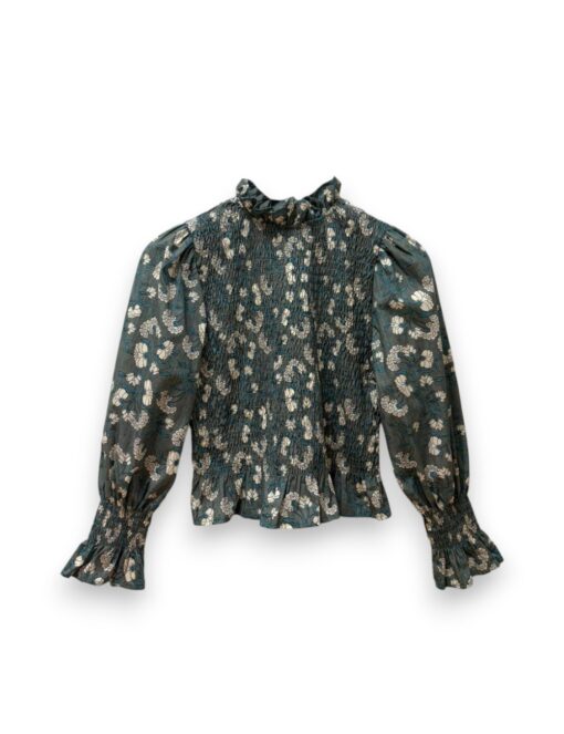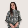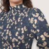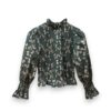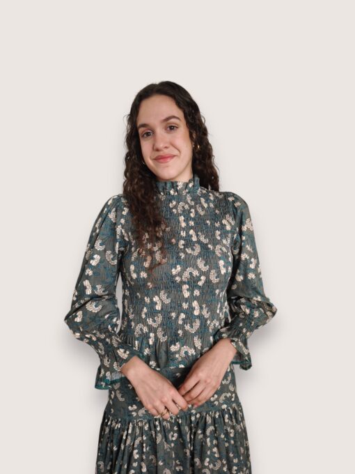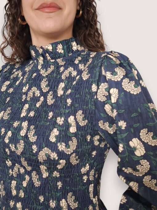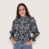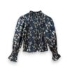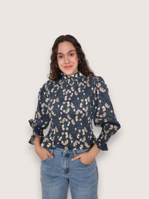 Blusa de algodón con estampado de flores. Cuerpo elástico en nido de abeja y manga ligeramente abullonada. Largo a la cintura. Puño elástico con volantito.