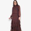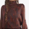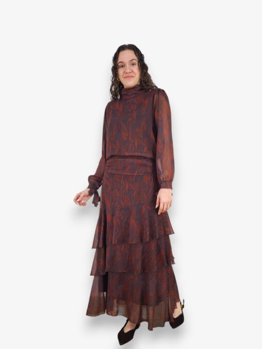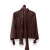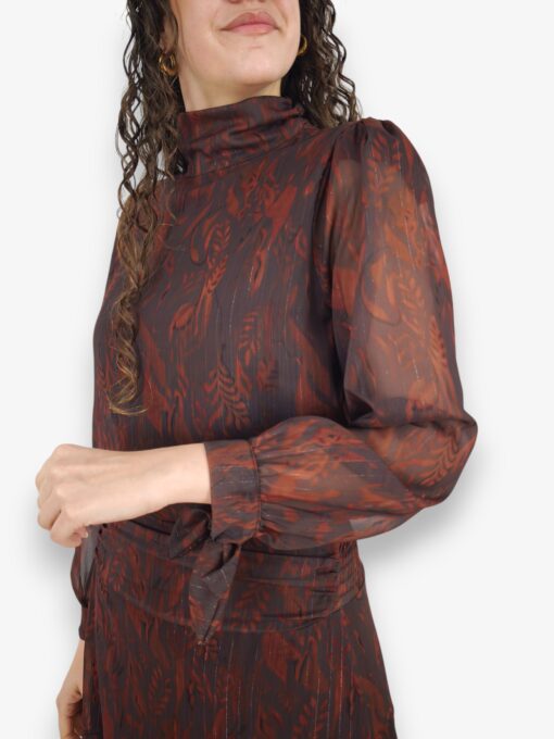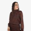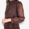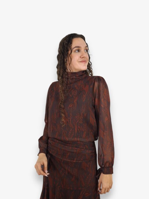 Blusa de gasa estampada con hilo de lurex. Cuello perkins y puños con terminación en lazo. Lazo de gasa extra para poner en el cuello o como cinturón.