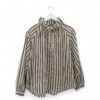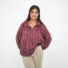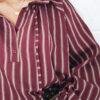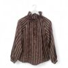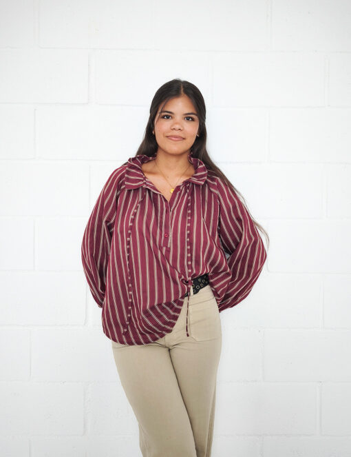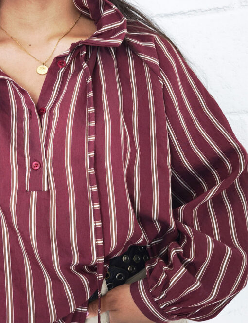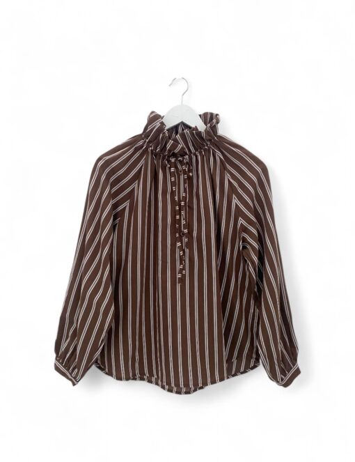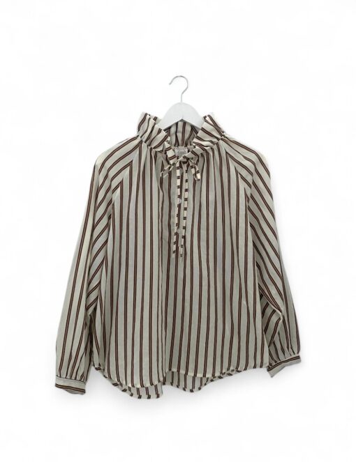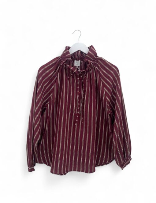 Blusa de rayas de corte amplio y escote de pico con 3 botones. Volante en el cuello y cierre de cordón. Manga ranglan abullonada.