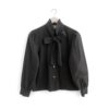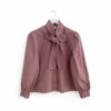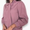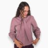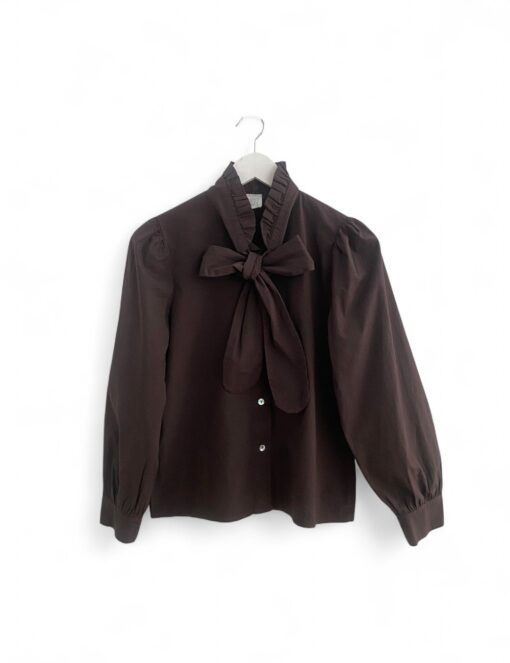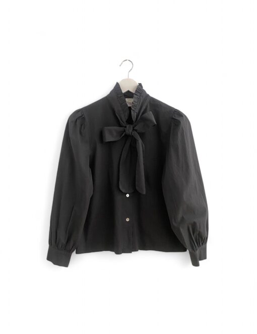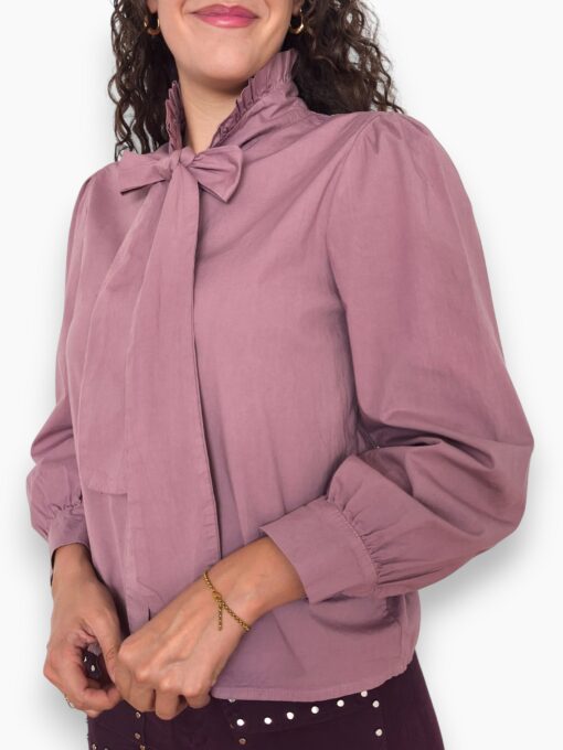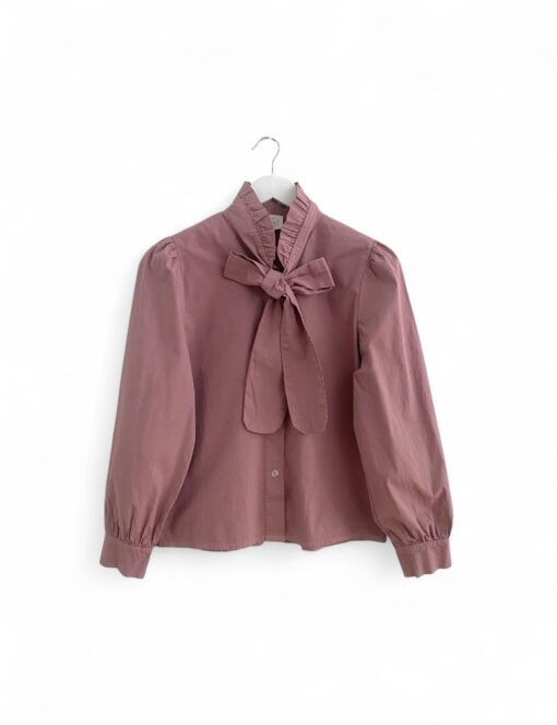 Blusa lisa de algodón con cuello de volante y maxi lazo. Abotonadura delantera y manga larga con puño de botón.