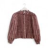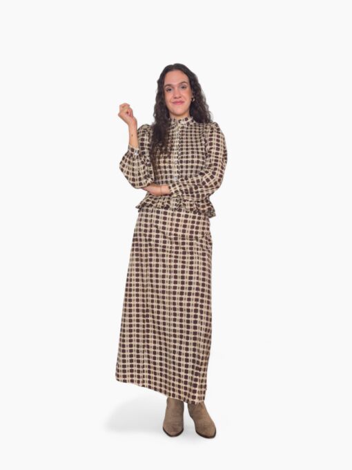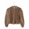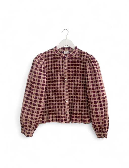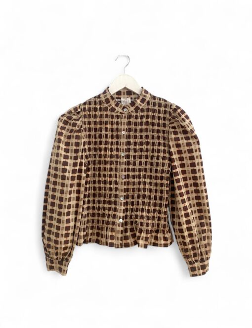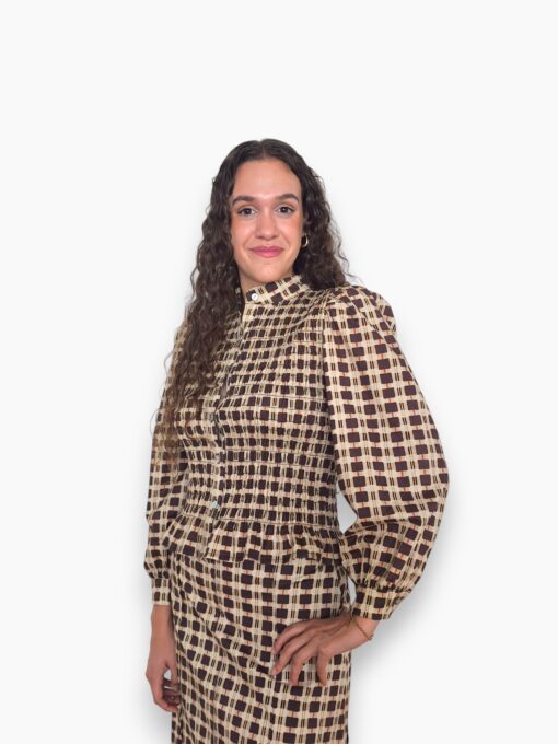 Blusa estampada con cuerpo elástico en nido de abeja. Cuello de tira y abotonadura delantera. Manga abullonada y botón en los puños.