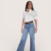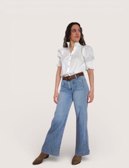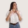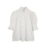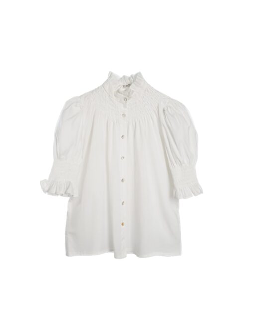 Blusa blanca de algodón con maxi cuello elástico. Abotonadura delantera y manga corta abullonada con elástico en el puño.