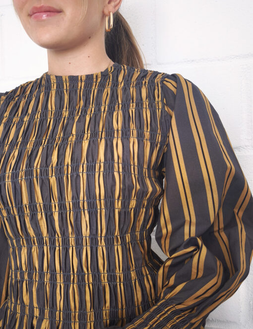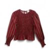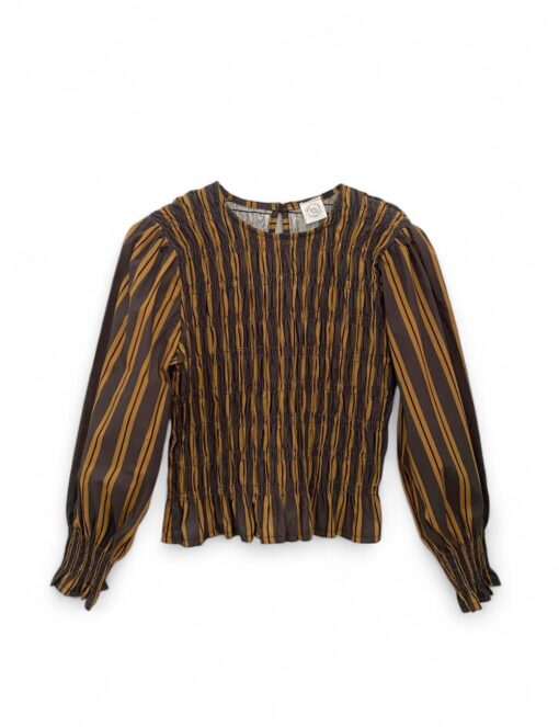 Blusa estampada de algodón con cuerpo elástico de nido de abeja y volante inferior. Cuello redondo y manga larga abullonada.