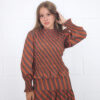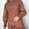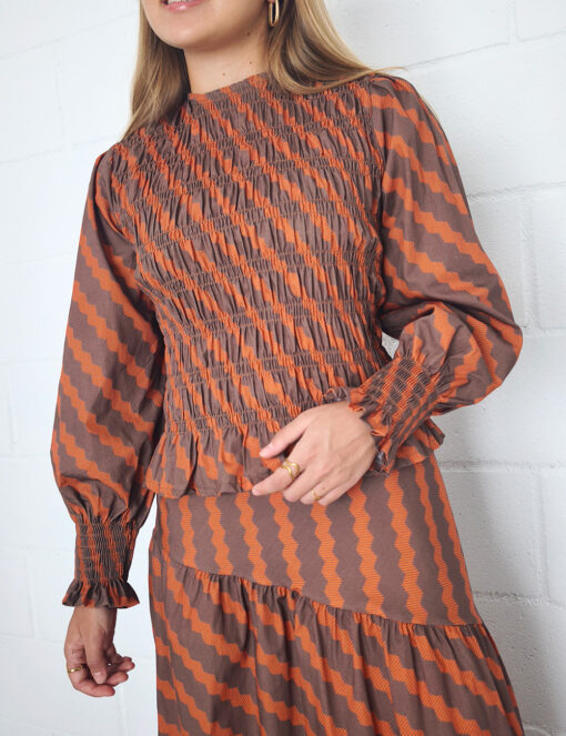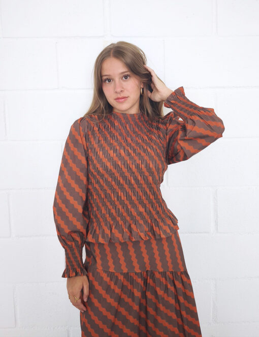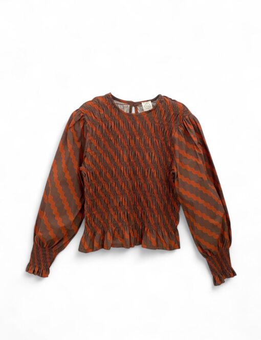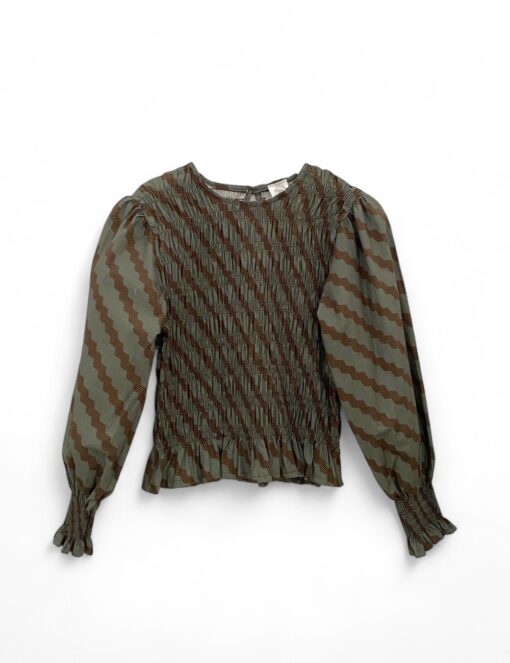 Blusa estampada de algodón con cuerpo elástico de nido de abeja y volante inferior. Cuello redondo y manga larga abullonada.