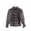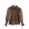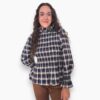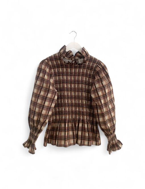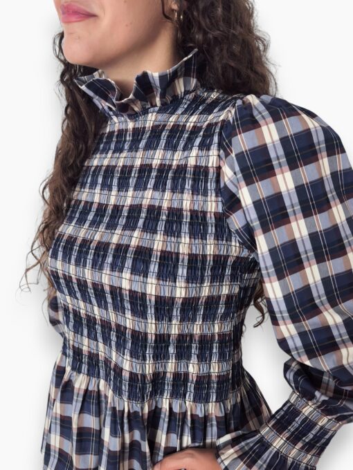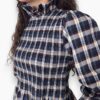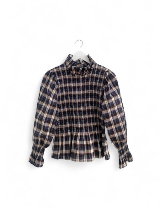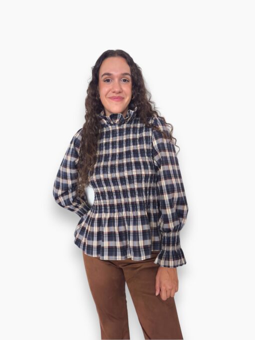 Blusa peplum con volante bajo y estampado de cuadro escocés. Cuerpo elástico en nido de abeja. Cuello alto con volante con botón trasero.