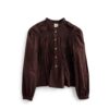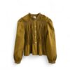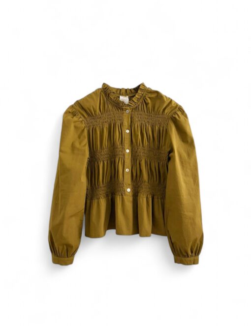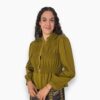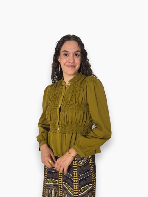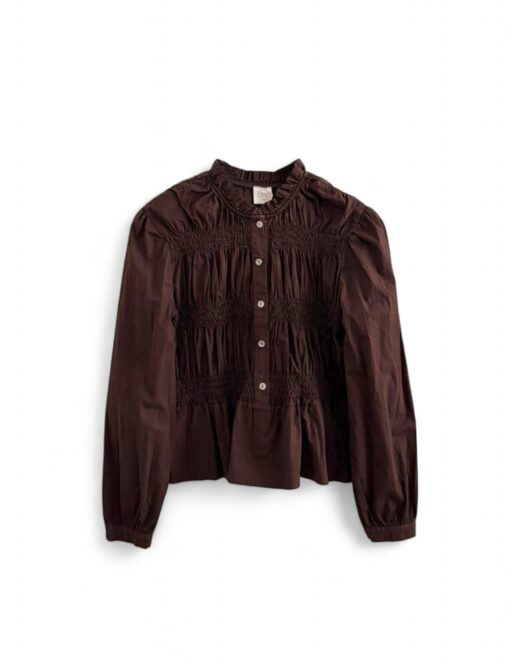 Blusa lisa de algodón de corte peplum. Cuerpo fruncido botonadura delantera. Cuello de tira con volante y botón en el puño.