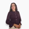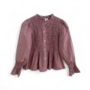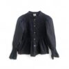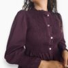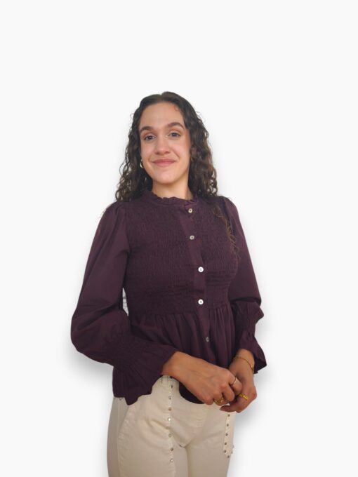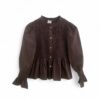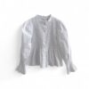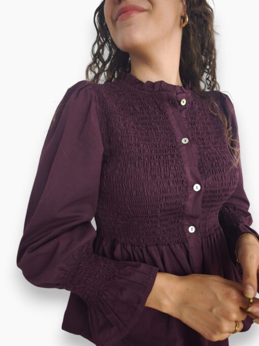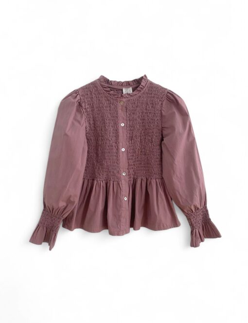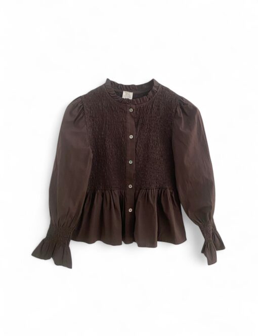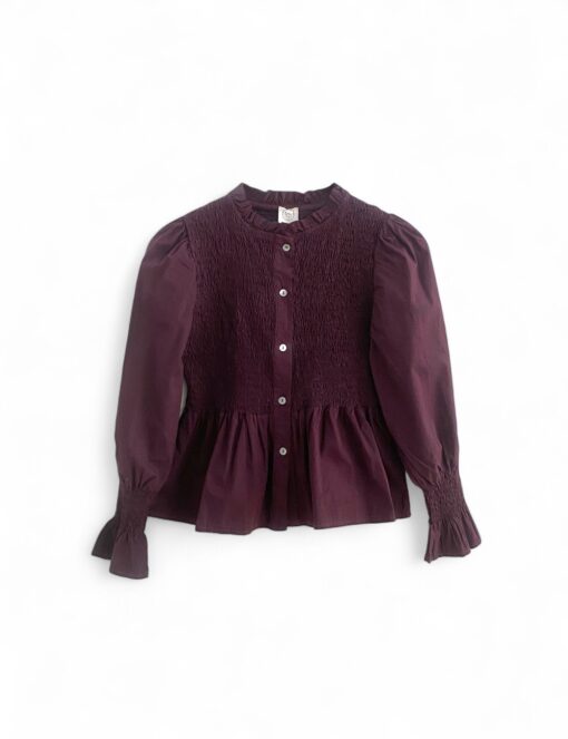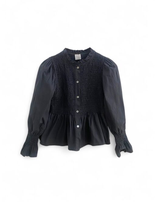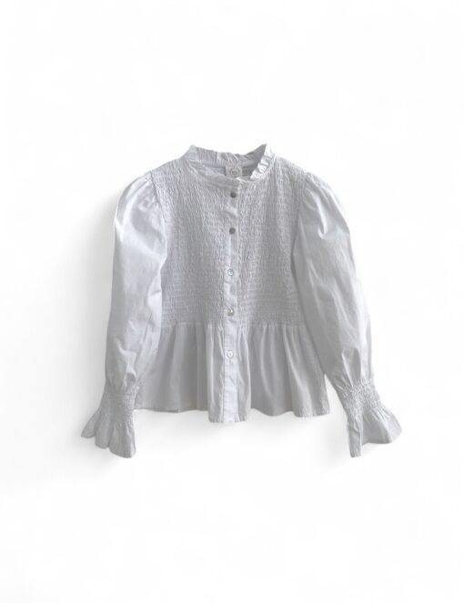Camisa de algodón con cuerpo de nido de abeja y botonadura delantera. Volante en la parte inferior y en el puño.