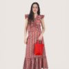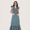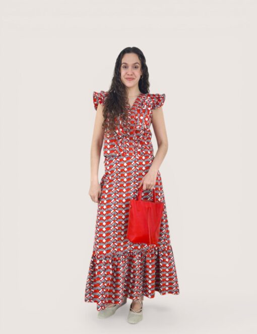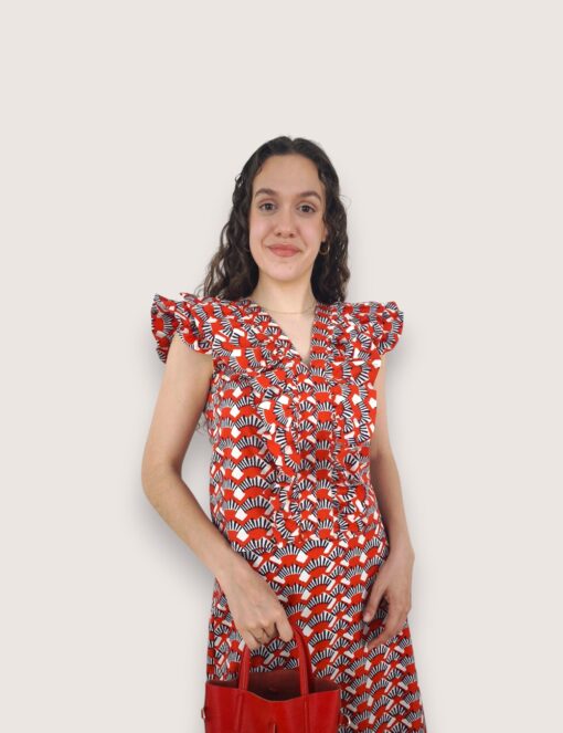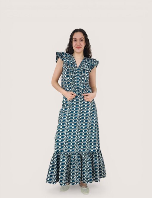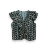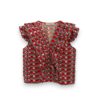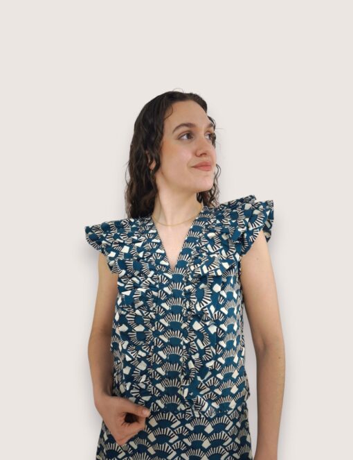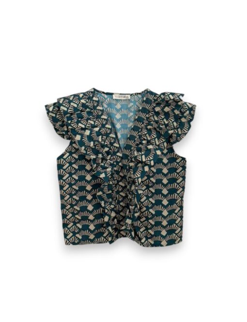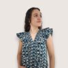 Blusa de algodón estampada con cuello de pico y sin mangas. Volante en hombreras y pecho.