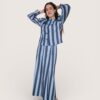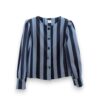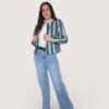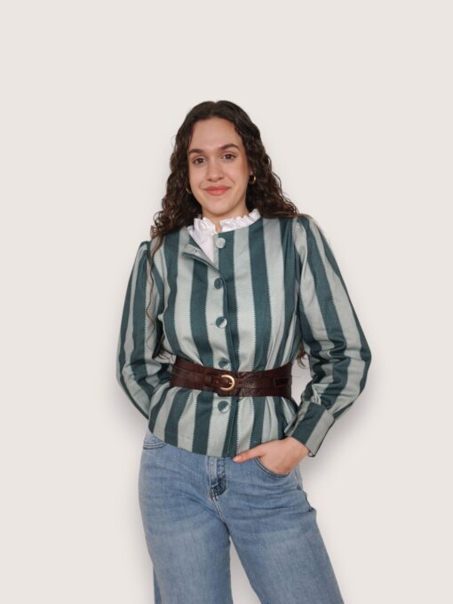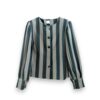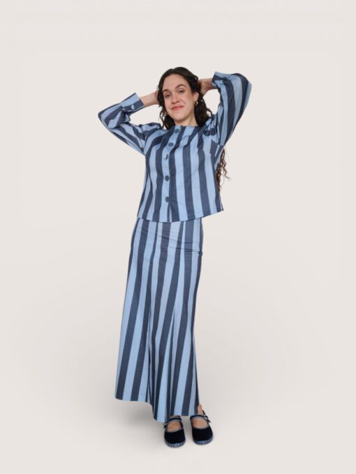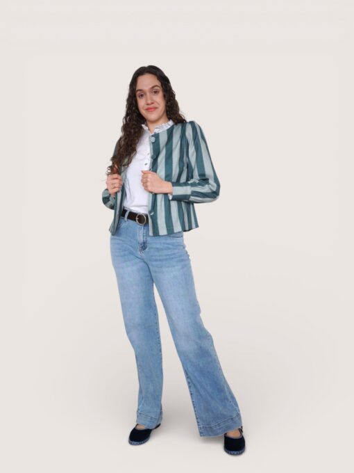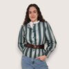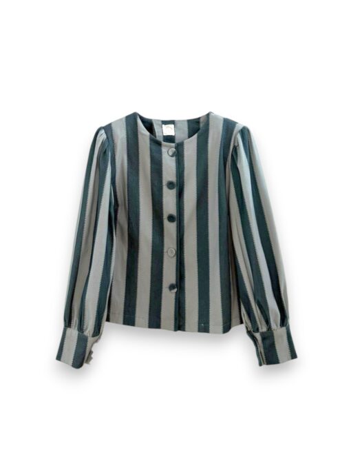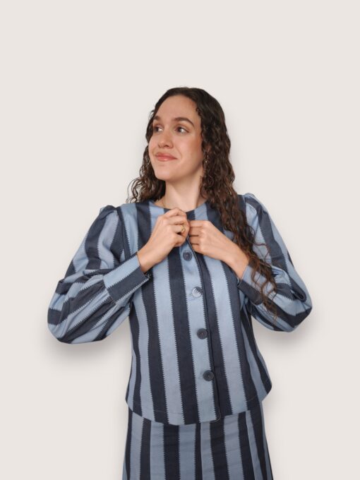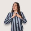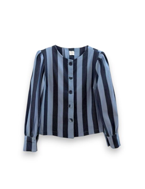 Blusa con estampado de raya ancha y largo a la cintura. Tejido de algodón elástico. Cuello caja y manga ligeramente abullonada. Botones forrados.