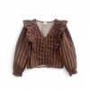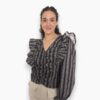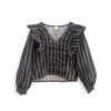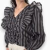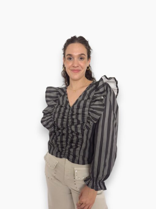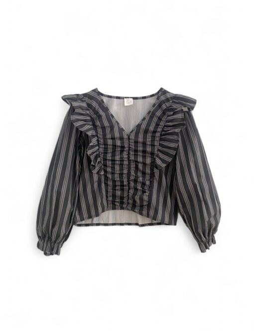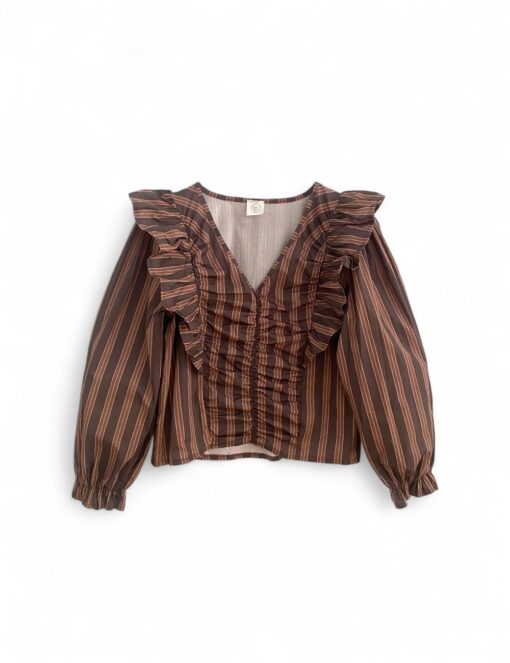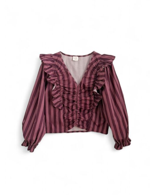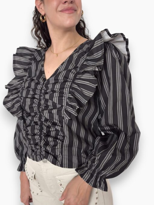 Blusa corta de algodón con estampado de rayas y escote de pico. Fruncido en el pecho y maxi volante en los hombros.