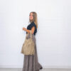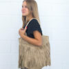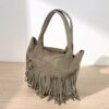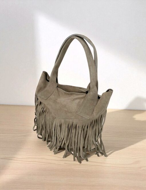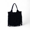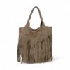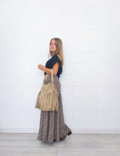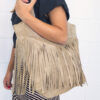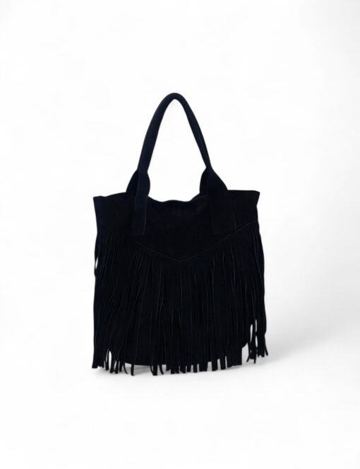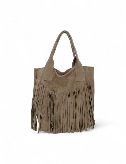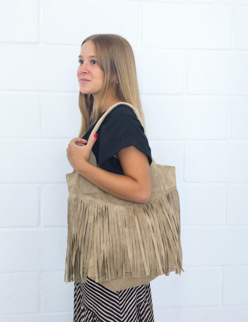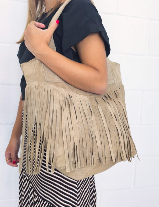 Bolso grande de piel de serraje con flecos largos. Asas de tamaño medio para llevar al hombro o de mano. Cierre con cremallera. Pequeño bolsito interior.
