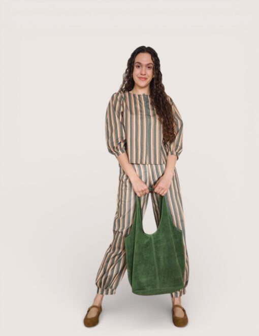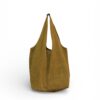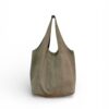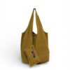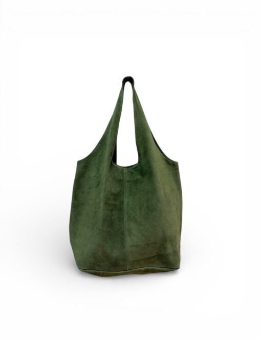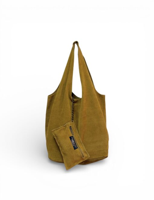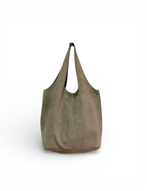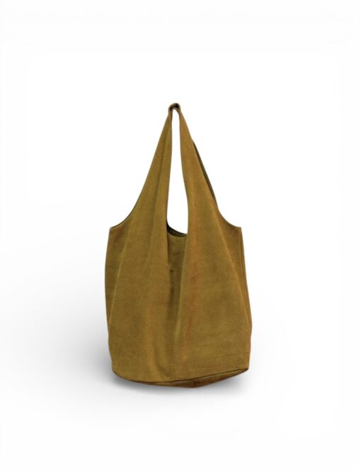 Bolso de piel de serraje en forma de saco. Compartimento principal espacioso con pequeña cremallera interior y pequeño bolsito unido con cadena.