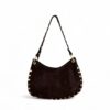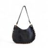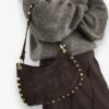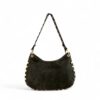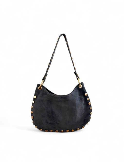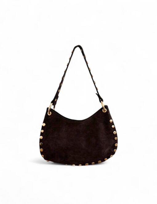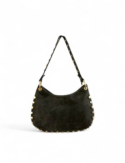 Bolso de piel de serraje con cierre de cremallera. Forro interior. Decorado con tachas doradas en el lateral. Bolsillo interior. Incluye correa larga regulable para bandolera.