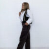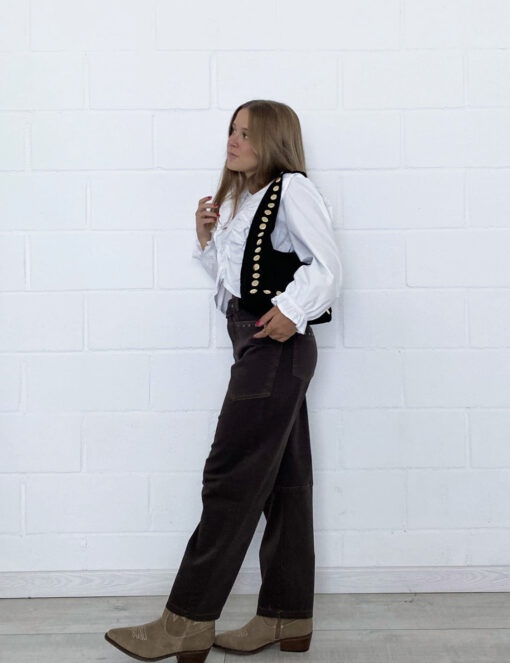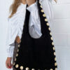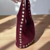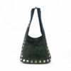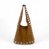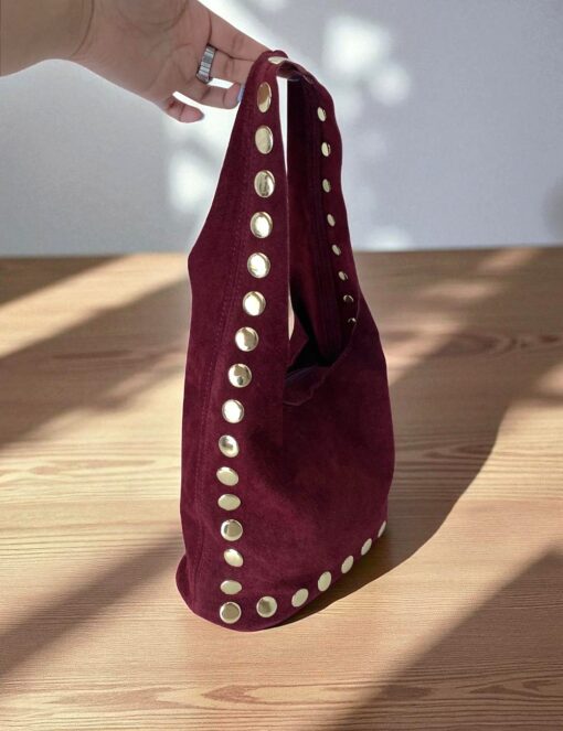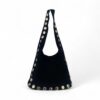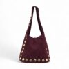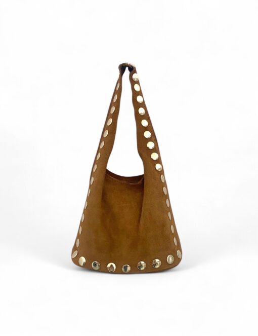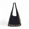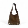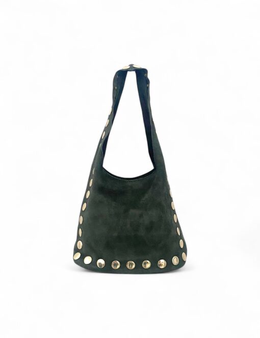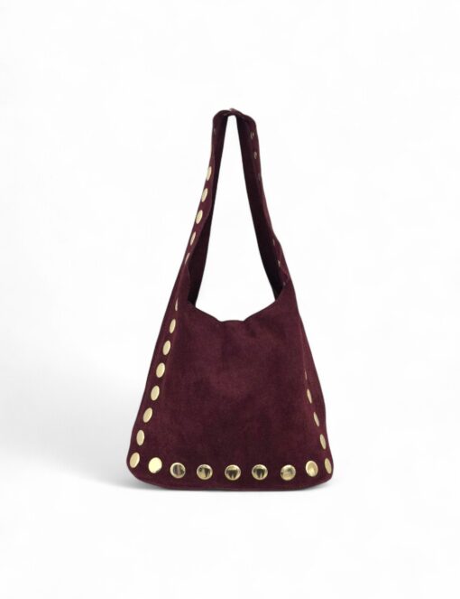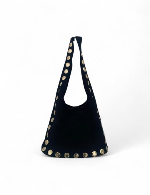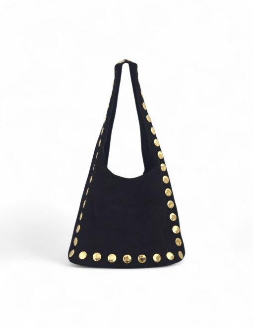 Bolso de piel de serraje tipo saco con asa media. Decorado con tachuelas grandes en color dorado. Cierre de cremallera