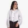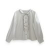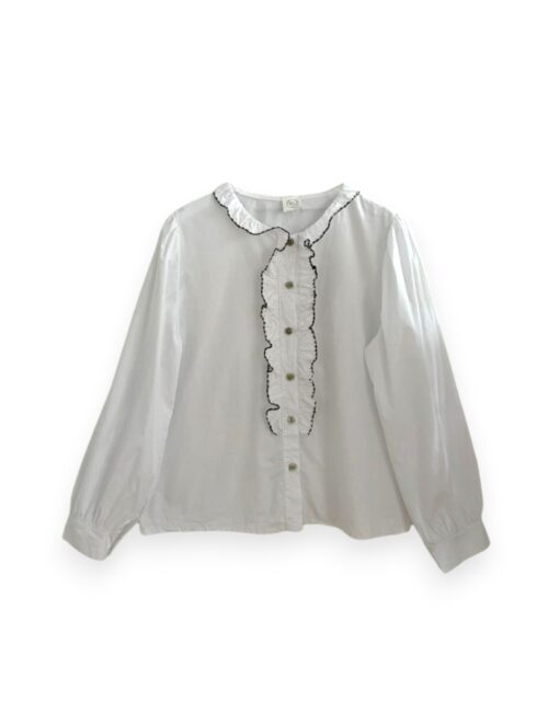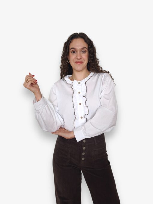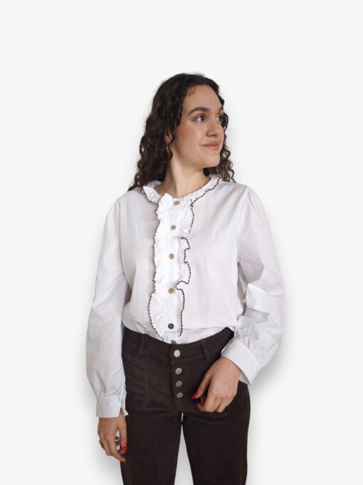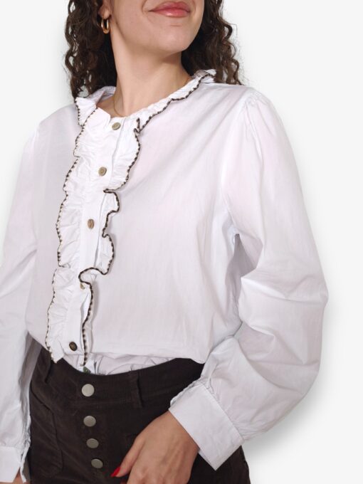 Camisa blanca de algodón con chorrera de volante terminado en vivo de tono marrón. Cuello redondo con volantito.