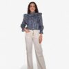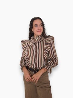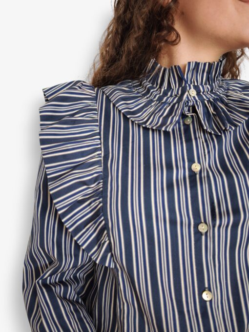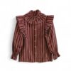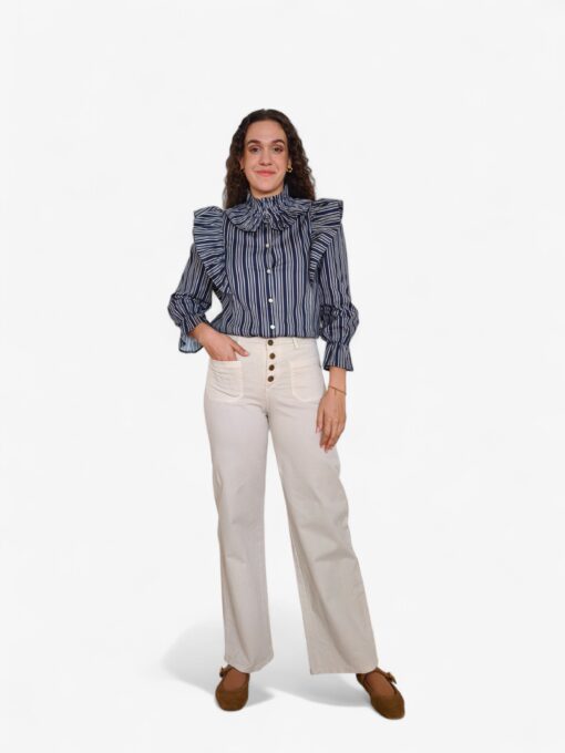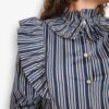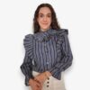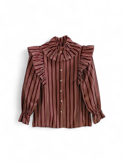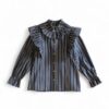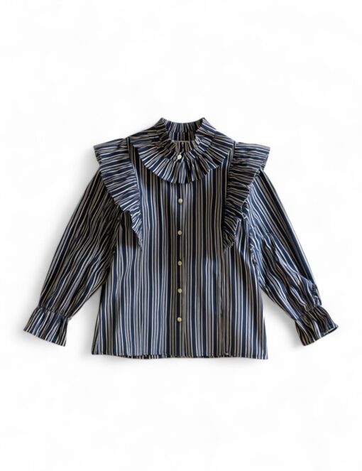 Camisa con estampado de rayita fina. Cuello babero y volante en hombrera. Botonadura delantera y puño elástico.
