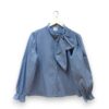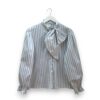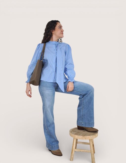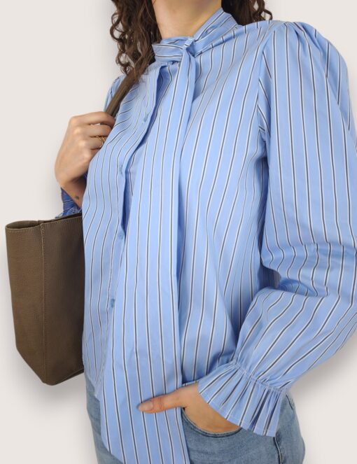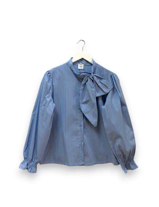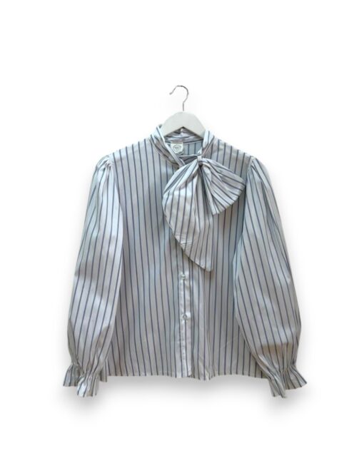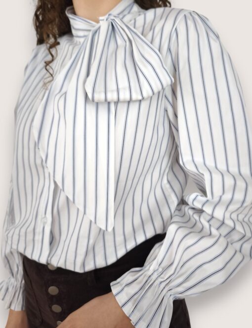 Camisa de algodón con estampado de rayas. Botonadura delantera y cierre en el cuello con lazo grande. Elástico en los puños.