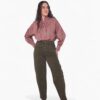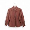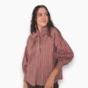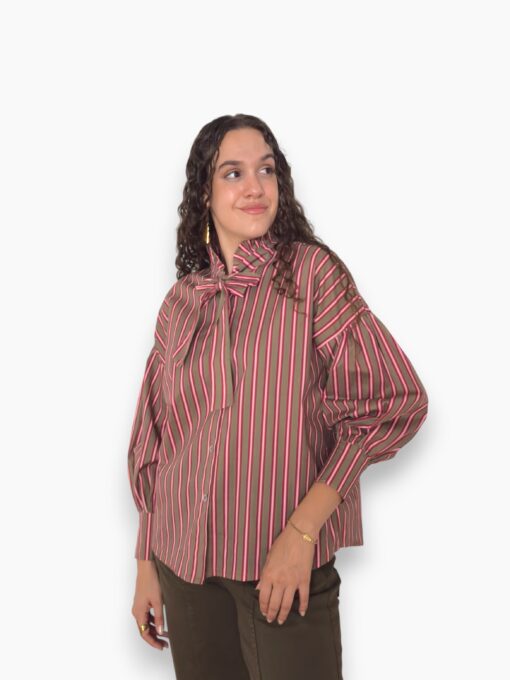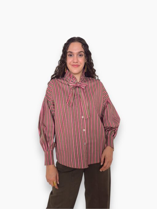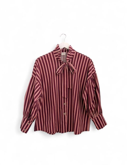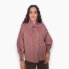 Camisa oversize de algodón con estampado de rayas. Volante en el cuello con terminación en lazo y hombro caído. Cierre de doble botón en el puño.