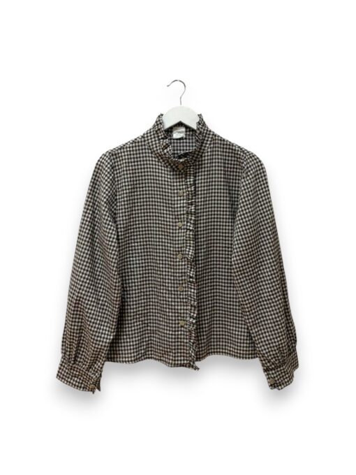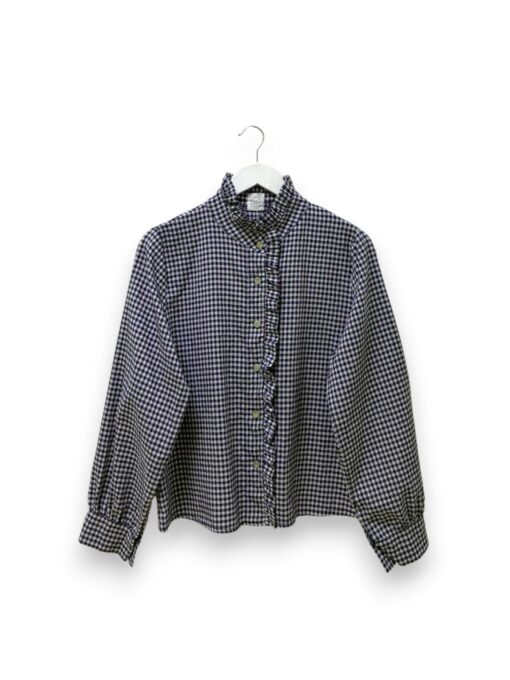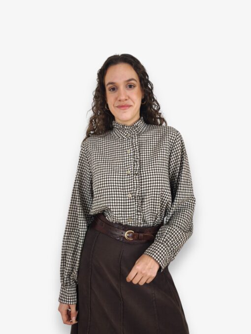 Camisa de algodón con estampado de cuadro vichy. Volantito delantero en cuello y en la botonadura. Puño con cierre de botón.