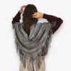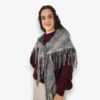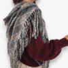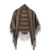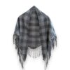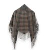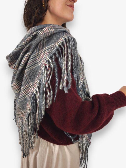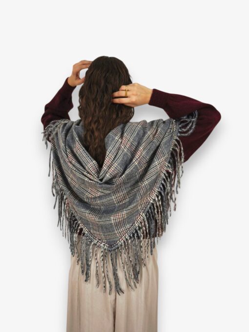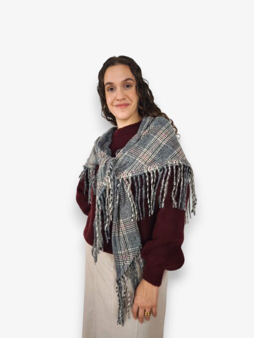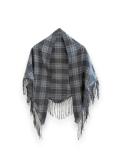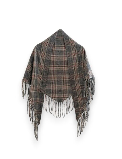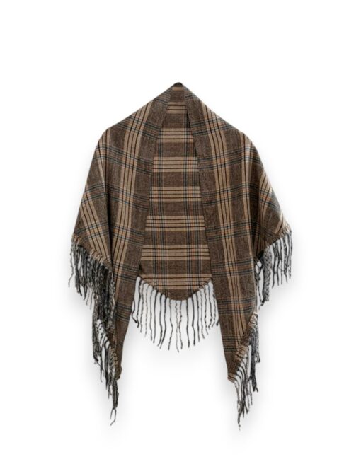 Capa de lana con estampado de cuadro escocés. Forma triangular con terminación en pico y decoración con flecos.