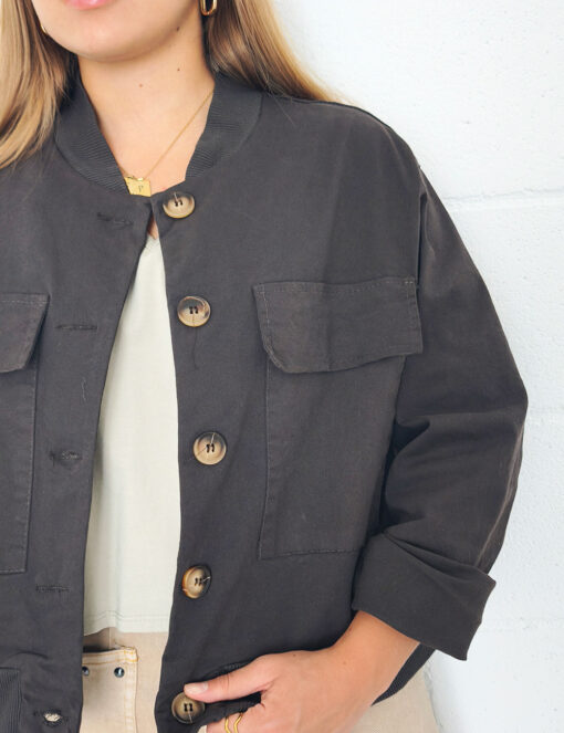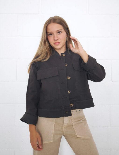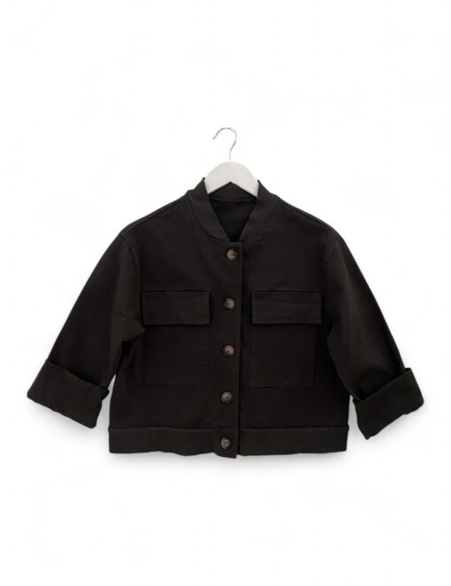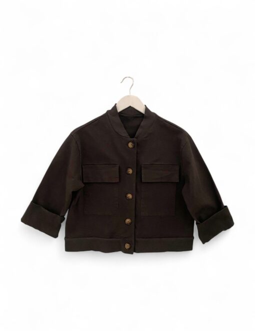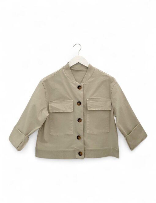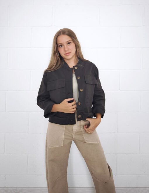 Chaqueta corta de algodón con cierre de botones. Bajo y cuello de punto elástico. Bolsillos grandes con solapa en la parte delantera.