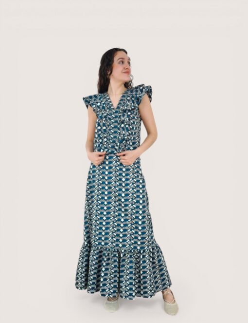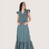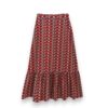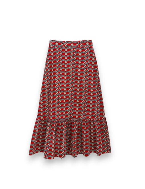 Falda larga estampada en tejido de algodón ligeramente elástico. Cinturilla trasera elástica y volante en la parte inferior.