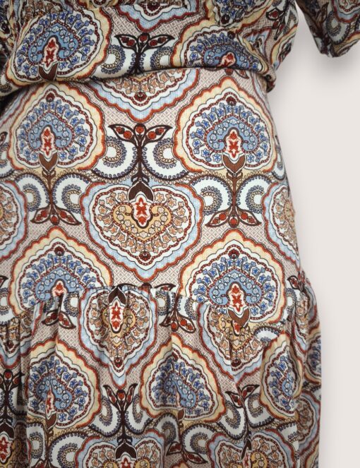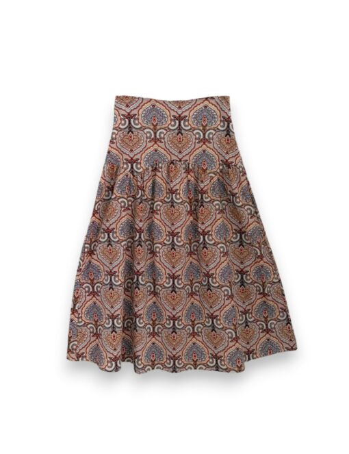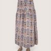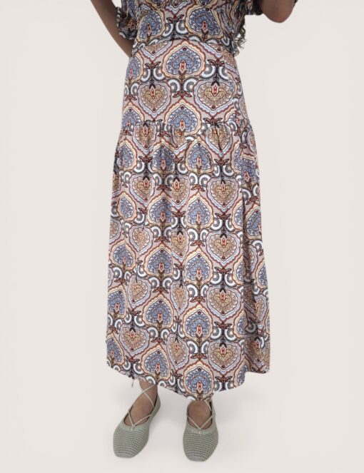 Falda larga estampada en tejido de algodón. Corte frontal con vuelo a la altura de la cadera. Cinturilla elástica.