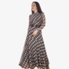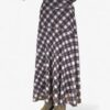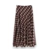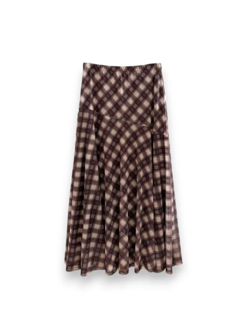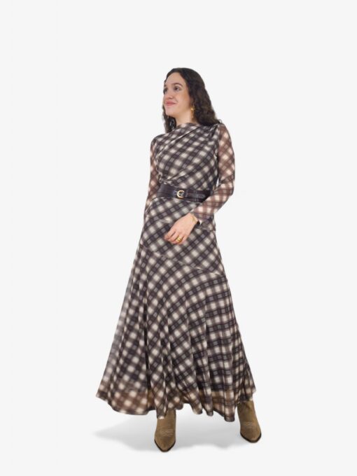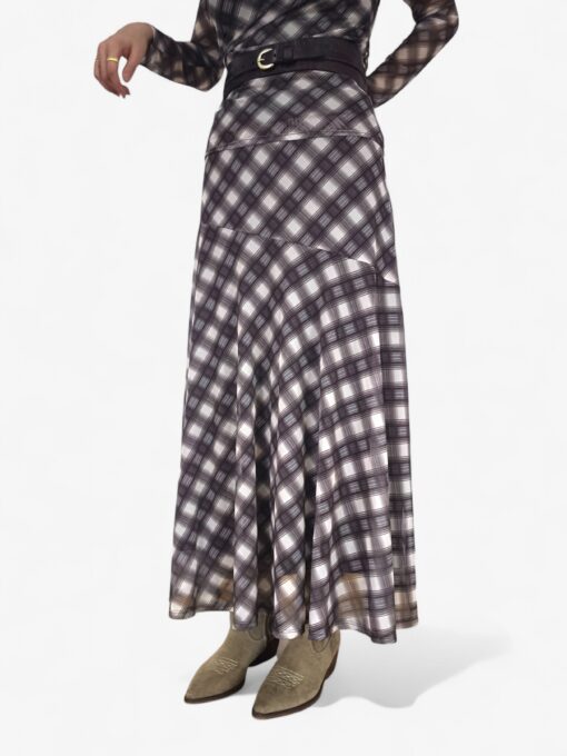 Falda larga marrón de cuadros en tejido de tul. Corte frontal asimétrico con vuelo desde la cadera. Forro completo y cinturilla elástica.