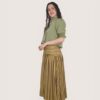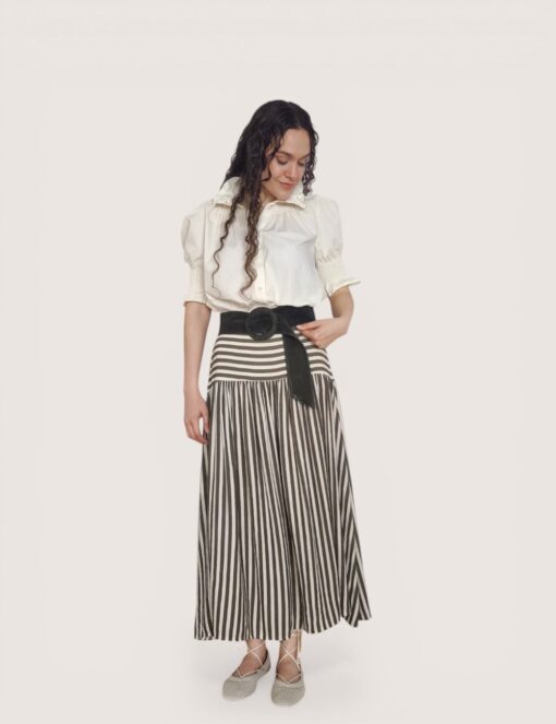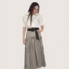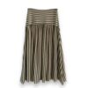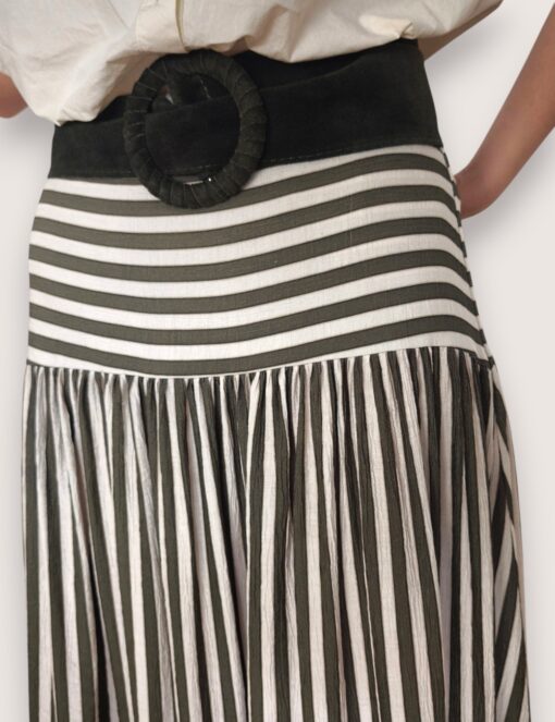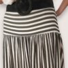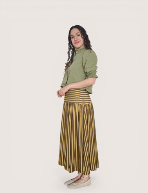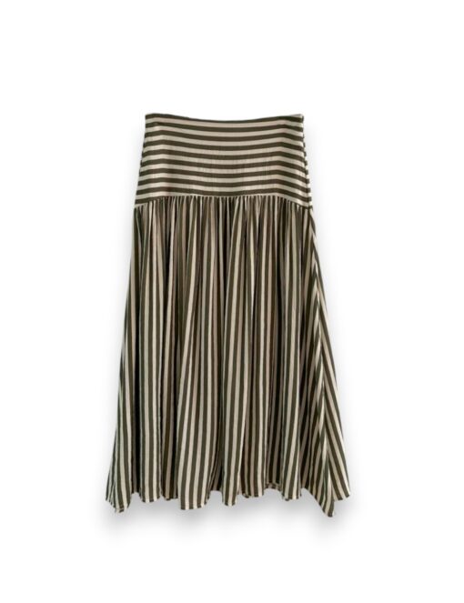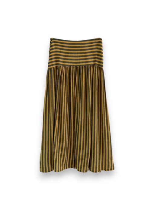 Falda larga con estampado de rayas y cinturillla elástica. Corte frontal con vuelo a partir de la cadera.