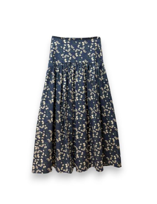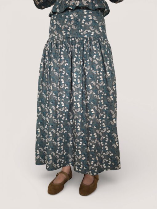 Falda larga de algodón con estampado de flores. Corte a la cadera con vuelo y cinturilla elástica.