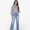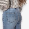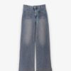 Pantalón vaquero en azul claro lavado con tiro medio y corte recto. Cierre de cremallera y botón. Bolsillos delanteros y traseros y bajo ancho.