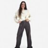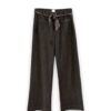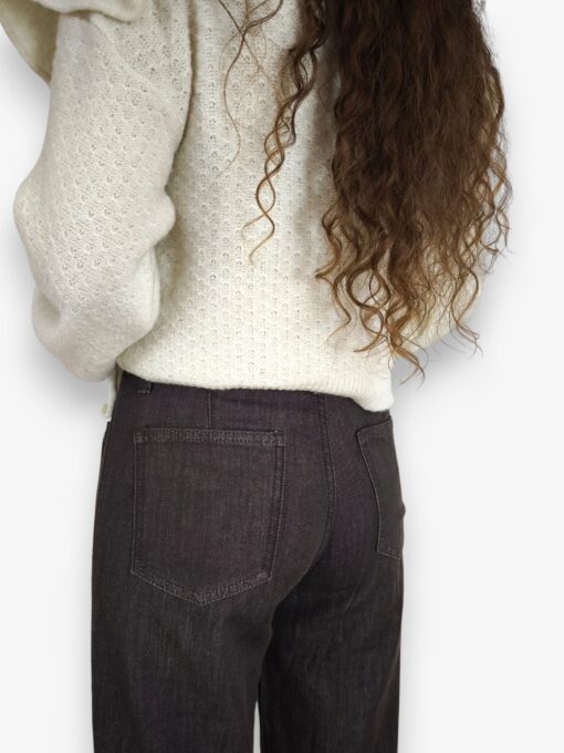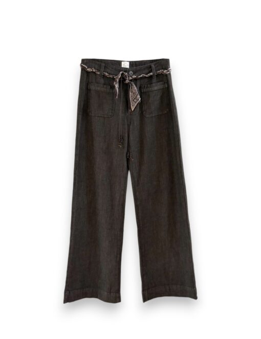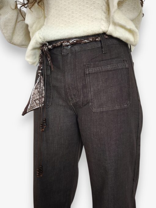 Jeans marrón en tejido lavado de algodón. Bolsillos delanteros y traseros. Cierre de botón y cremallera. Pañuelo a modo de cinturón.
