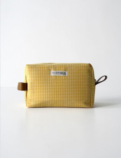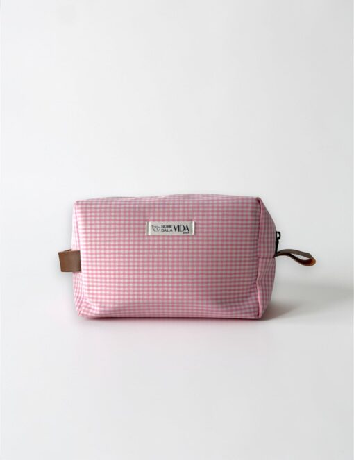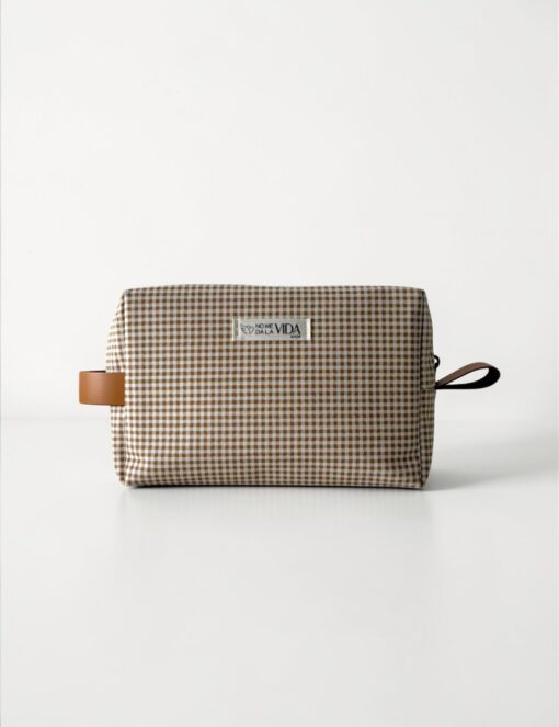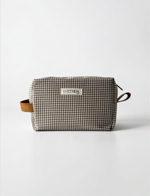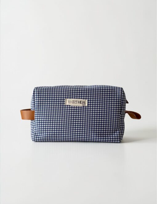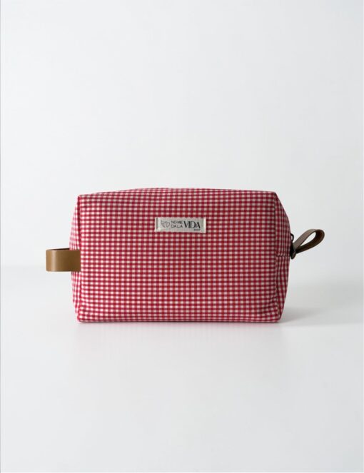 Neceser rectangular en tejido de algodón con estampado de cuadro vichy. Cierre de cremallera y doble asa.