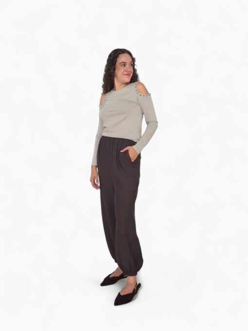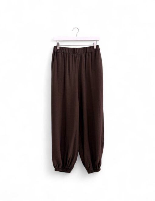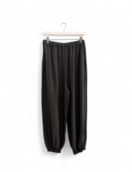 Pantalón bombacho liso en tejido fluido con goma en la cintura y en el tobillo. Tiro bajo y bolsillos laterales.