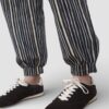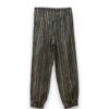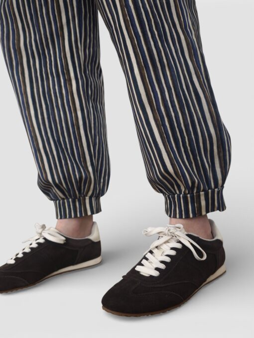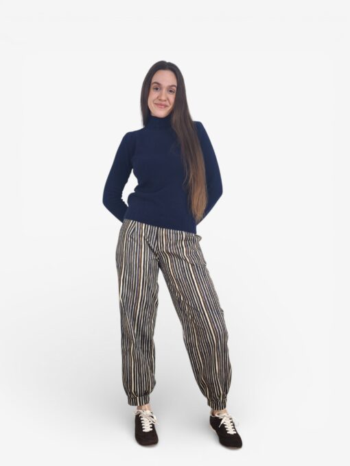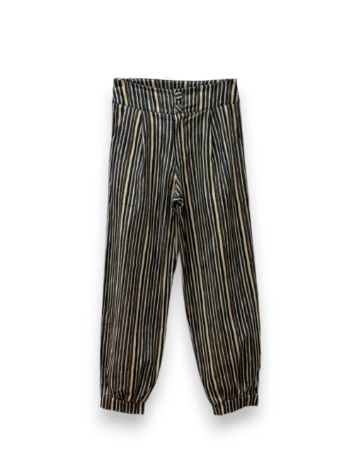 Pantalón bombacho de rayas con cierre de cremallera y botón. Pinzas delanteras y bolsillos laterales. Botones forrados.