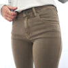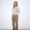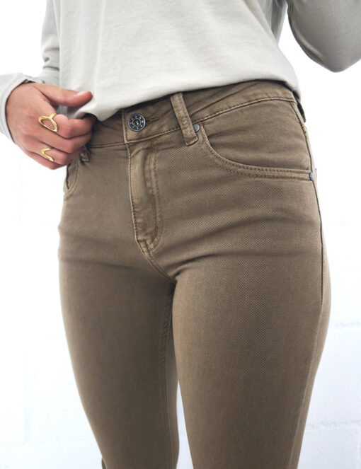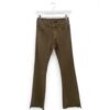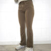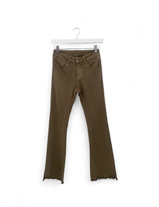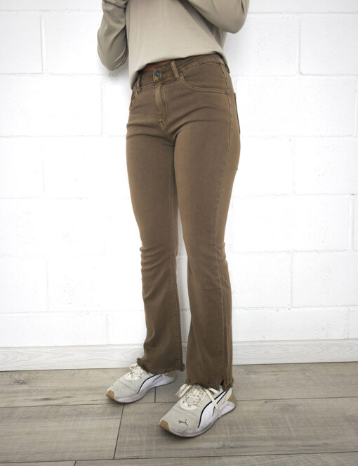 Pantalón ajustado en color marrón claro con tejido ligeramente elástico. Corte acampanado y bajo desflecado. Bolsillos traseros y delanteros