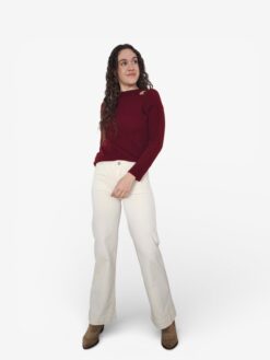 Pantalón recto beige con bolsillos delanteros y traseros, y cierre de botón y cremallera. Corte recto y tiro medio