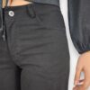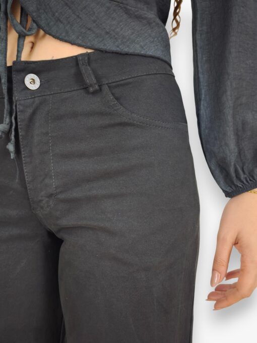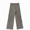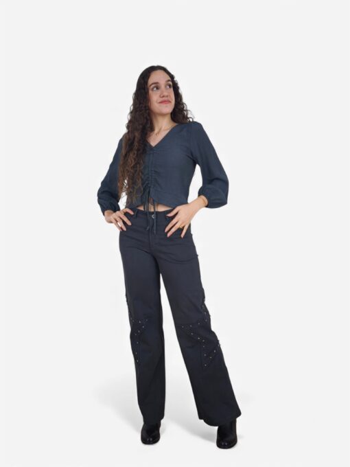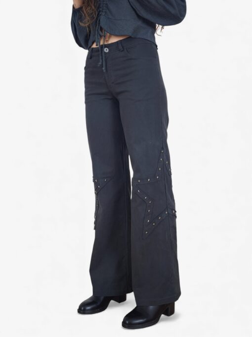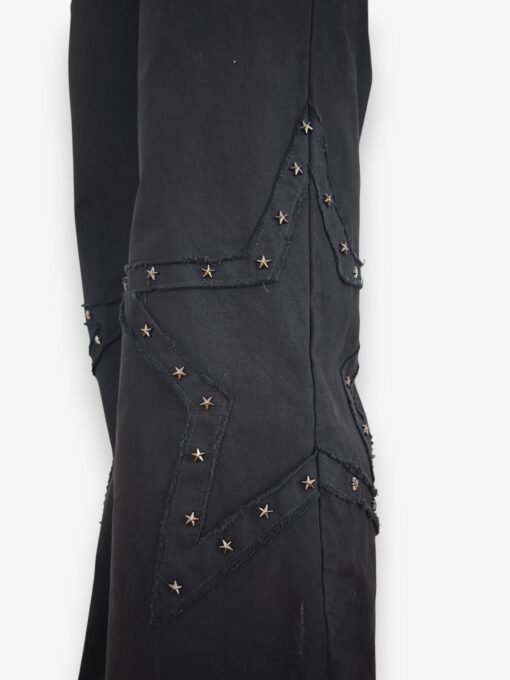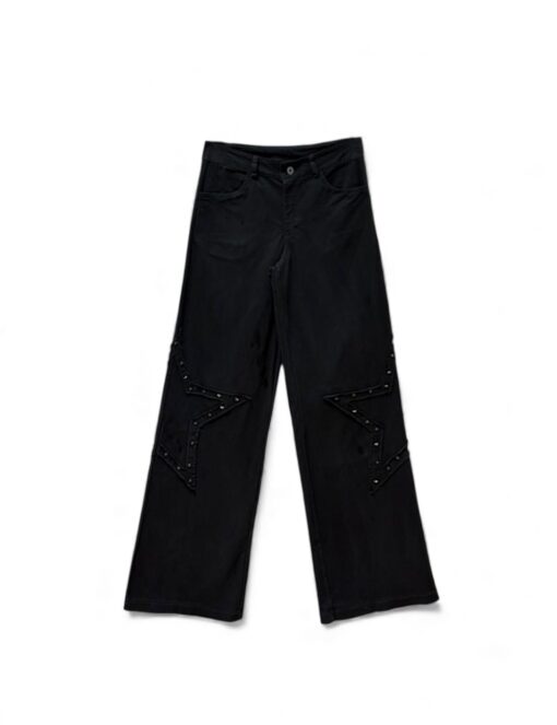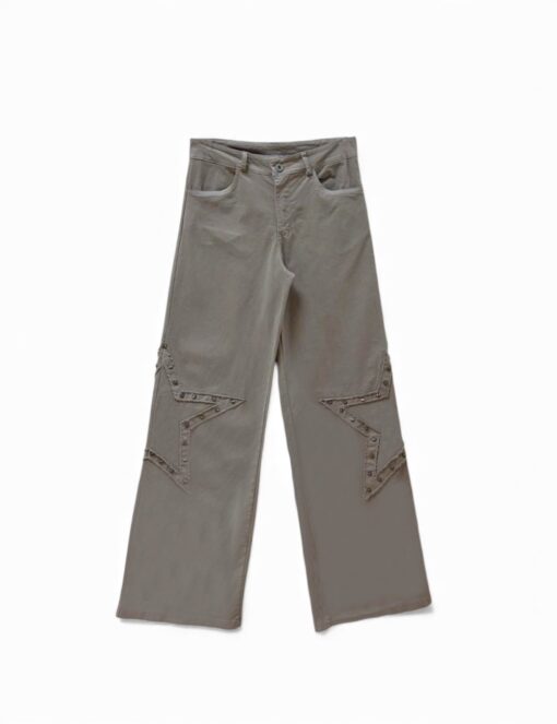 Pantalón recto ligeramente elástico con tiro bajo. Bolsillos delanteros y cierre de botón y cremallera. Estrella grande cosida a la altura de la rodilla.