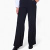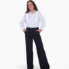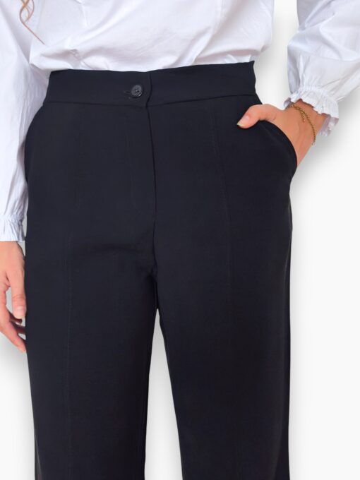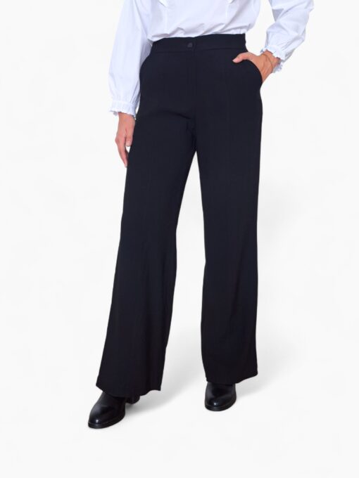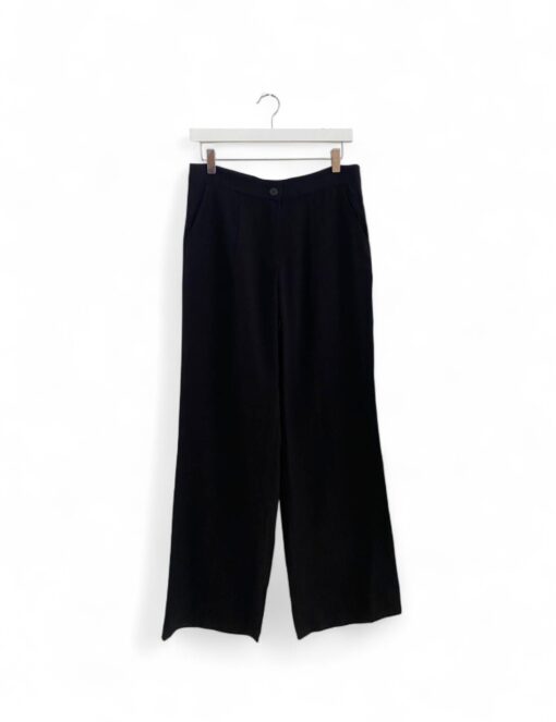 Pantalón de corte clásico con pinzas confeccionado en tejido fluido. Corte recto y bolsillos laterales. Cierre de botón y cremallera.