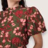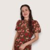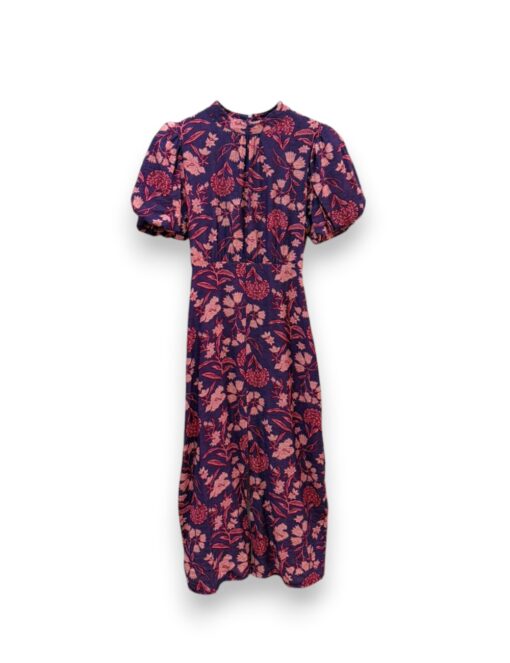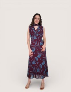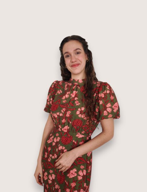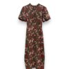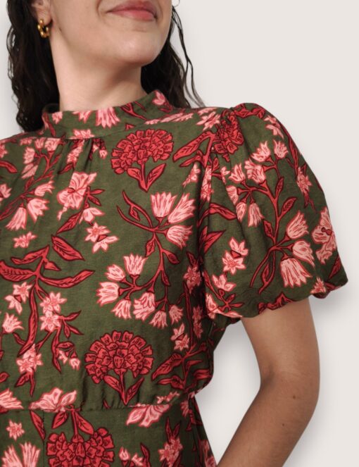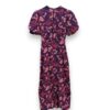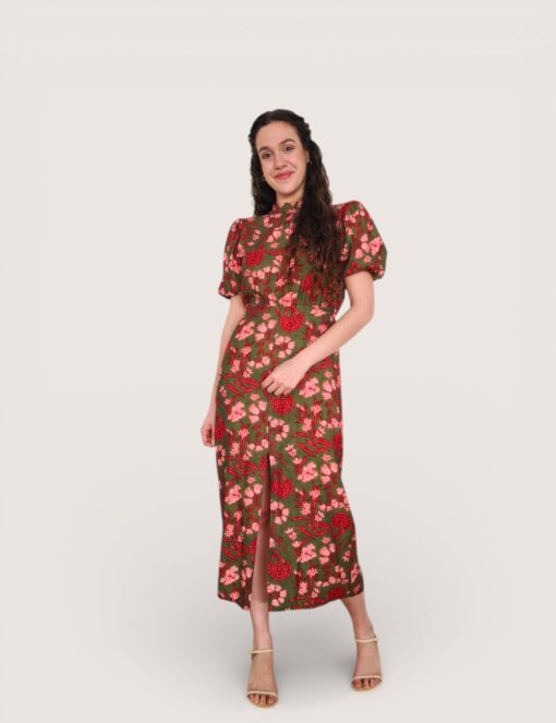 Vestido largo estampado de viscosa. Cuello perkins y manga abullonada. Cinturilla elástica y pequeño pliegue delantero. Abertura delantera.