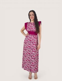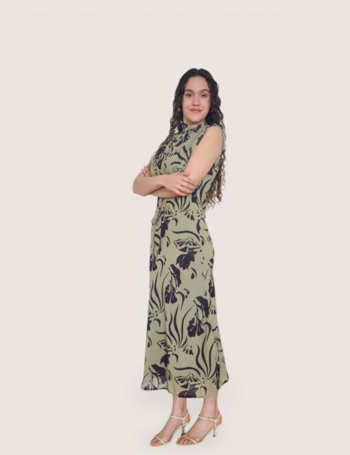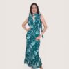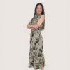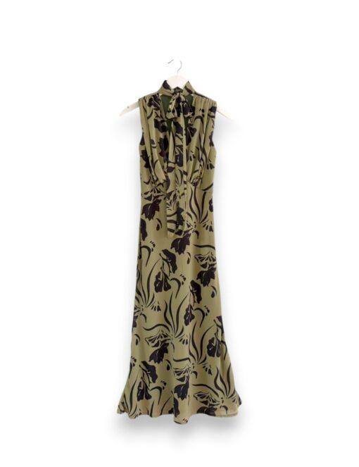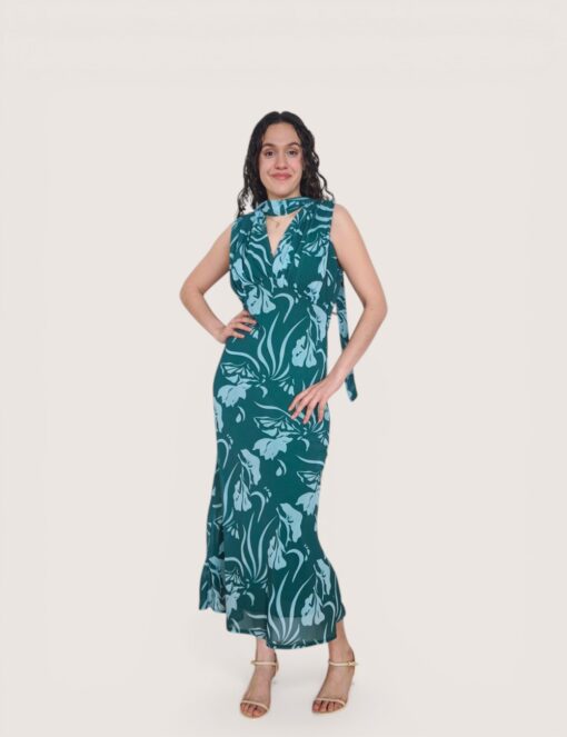 Vestido largo de gasa con cuello de pico terminado en tira larga. Tejido estampado fluido con forro interior. Corte imperio con fruncido en el pecho.