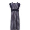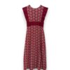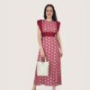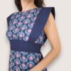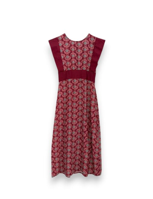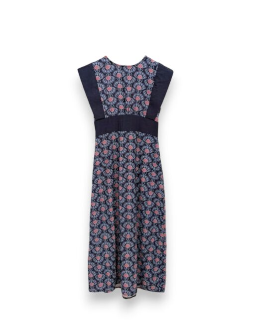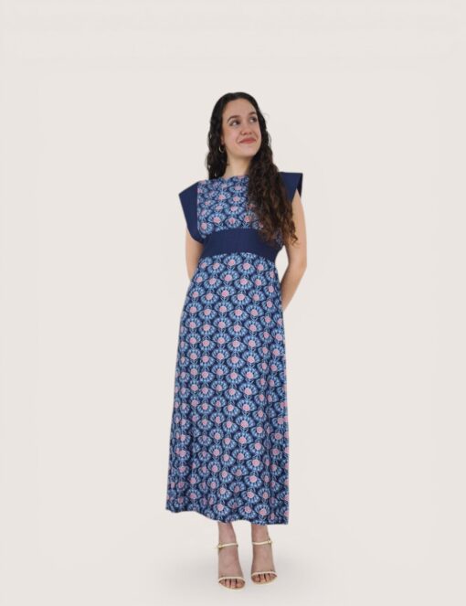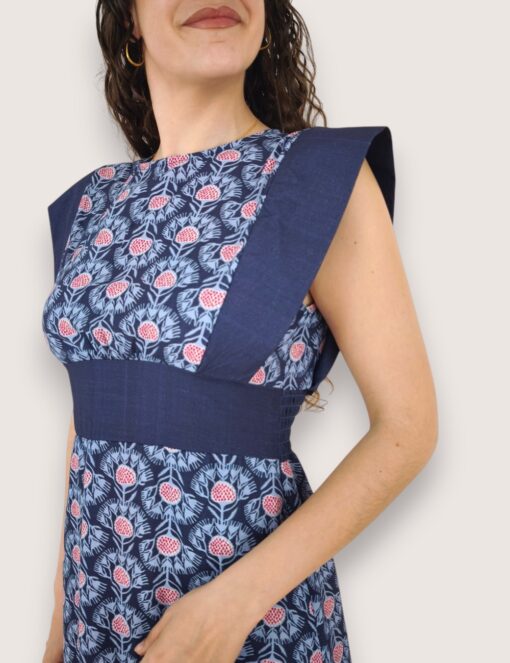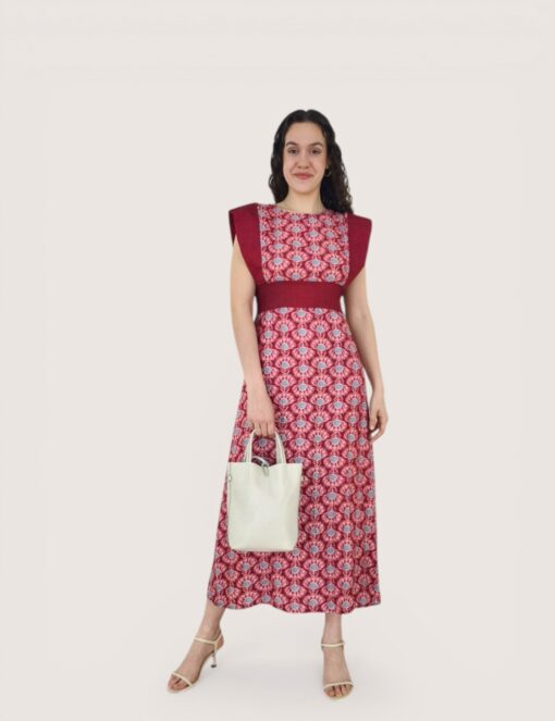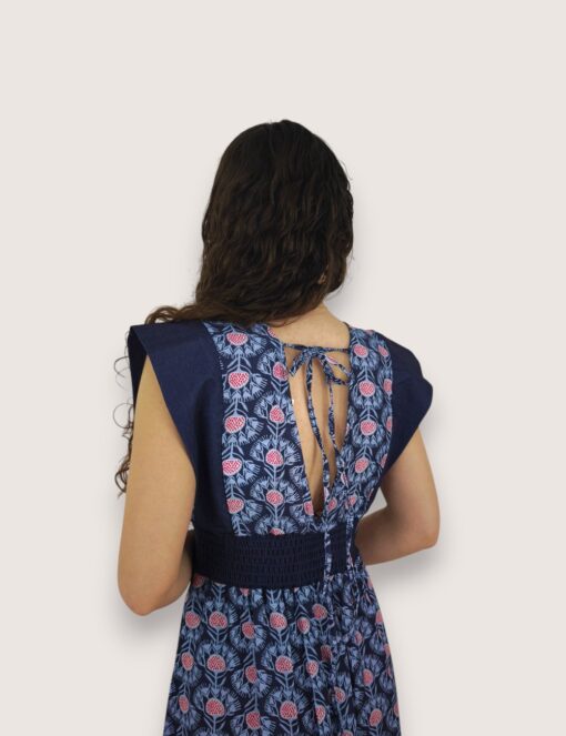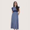 Vestido largo estampado con cuello redondo y espalda en pico con cierre de cordón. Hombreras y cintura con cinta ancha lisa al tono. Cintura entallada con elástico en la parte trasera.