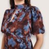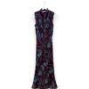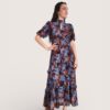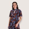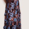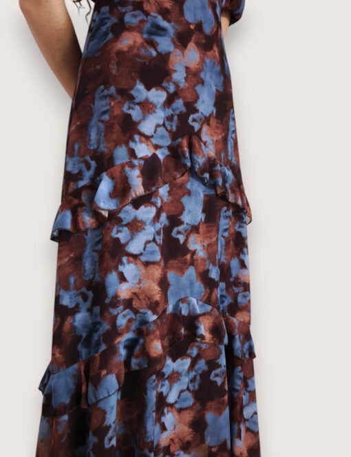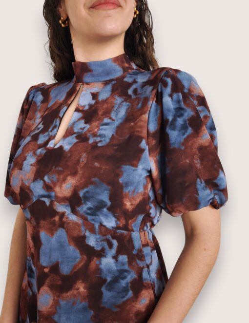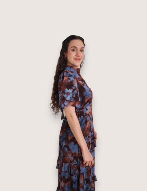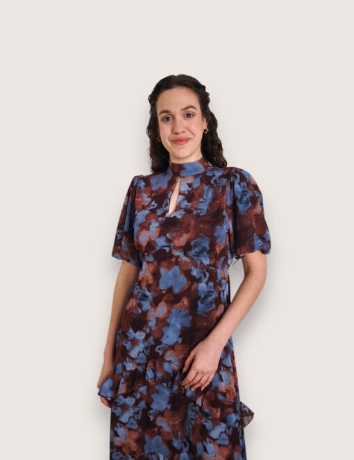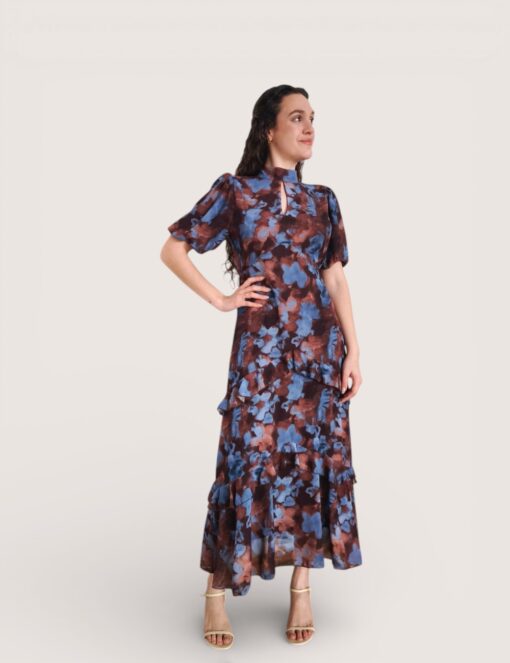 Vestido largo de gasa estampado con cuello perkins acabado en lazo trasero. Manga corta abullonada y pequeña abertura en el escote. Cinturilla elástica y volantes en la falda.